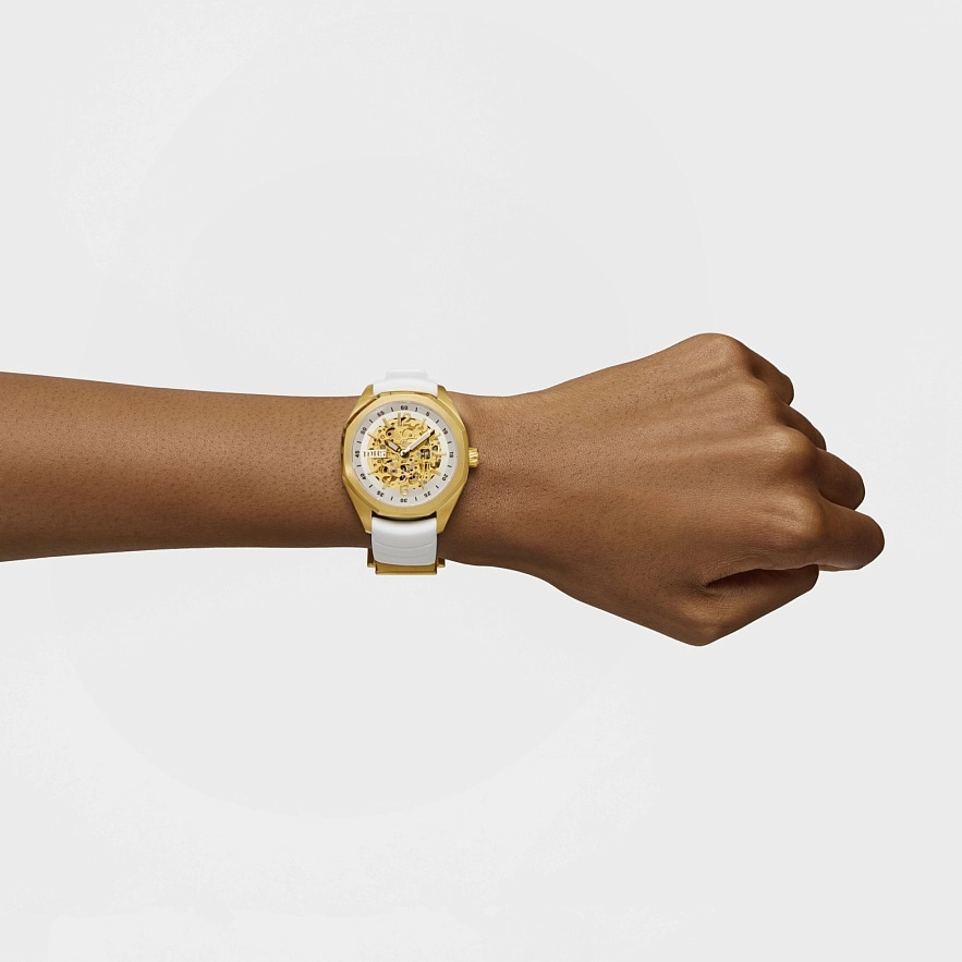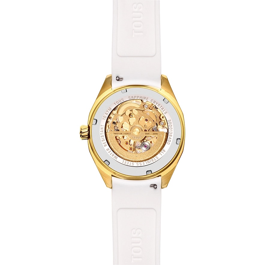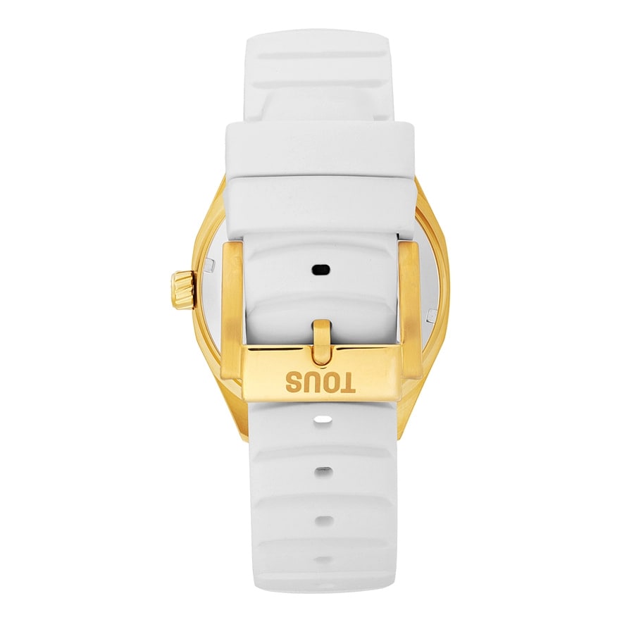 Годинник із золотистим корпусом із сталі з IP-покриттям та білим силіконовим ремінцем TOUS Now. Функції: години та хвилини. Водонепроникний до 10 АТМ. Якщо вам подобається конструкція часу, TOUS Now Skeleton Acero — це ваш безпрограшний вибір. Побачте на власні очі, як працюють внутрішні механізми. Не озирайтесь на минуле, пишіть свою історію і демонструйте її.