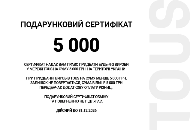 Замовляйте ідеальний подарунок – СЕРТИФІКАТ* TOUS. Сертифікат дає змогу придбати товари ТМ TOUS шляхом вирахування з роздрібної вартості товару номінальної вартості подарункового сертифіката. Подарунковий сертифікат діє у всіх магазинах TOUS на території України та не підлягає поверненню. Кінцева дата дії сертифікату зазначена на зворотній стороні.*Сертифікат – це фізична пластикова картка з вказаним номіналом.