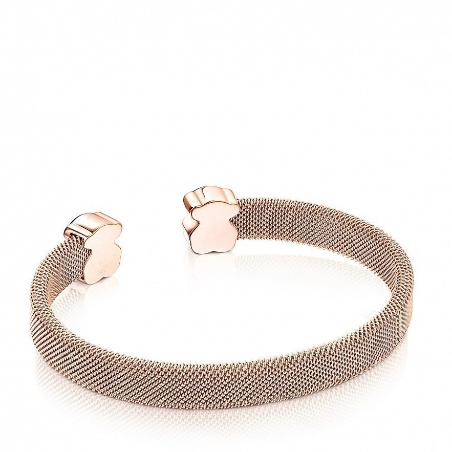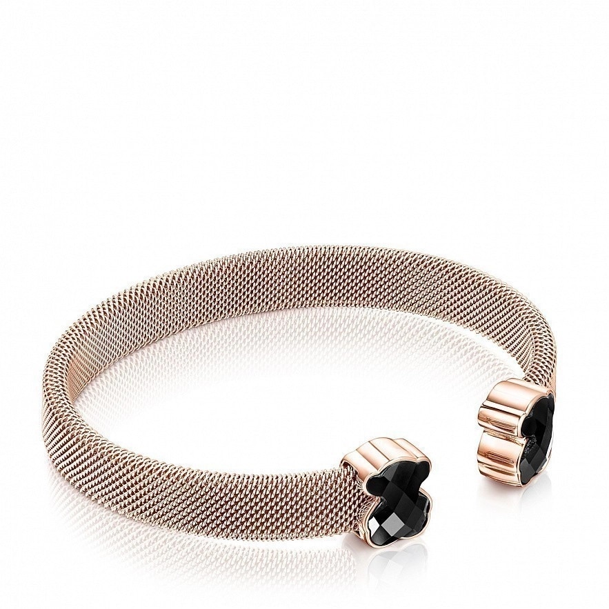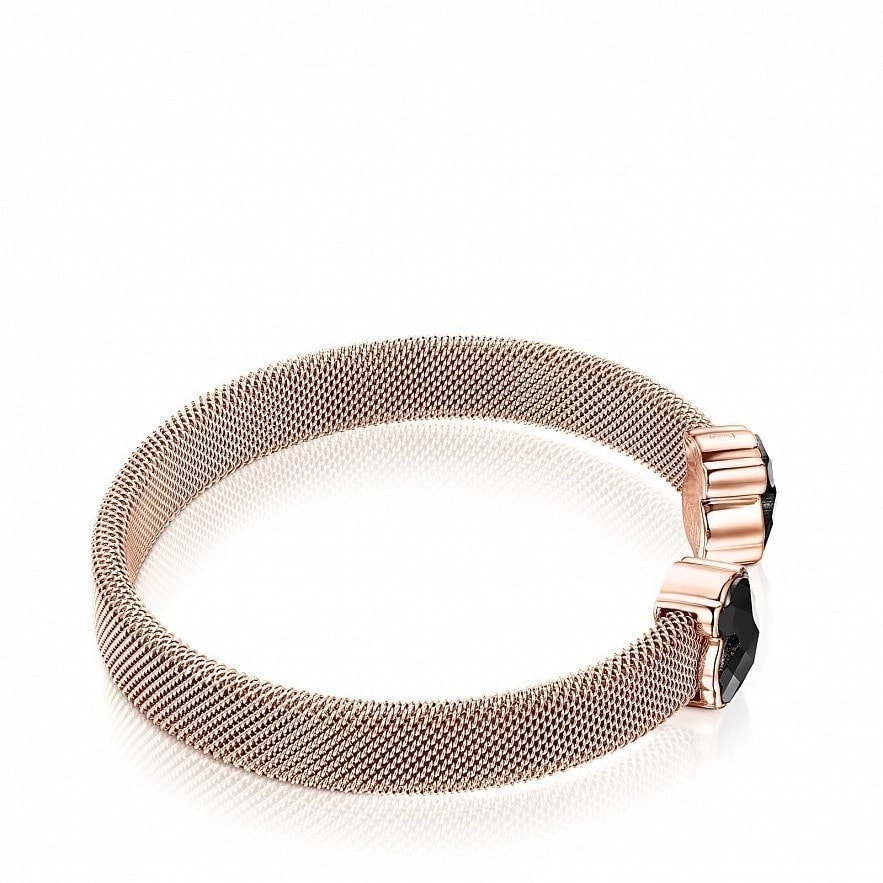 Браслет TOUS Icon Mesh зі сталі з рожевим IP-покриттям, з двома вставками з оніксу, обрамлених сріблом 925 проби з рожевим покриттям Vermeil . Розмір вставки: 1,1 см. Ширина браслету: 8 мм. Vermeil : срібло з покриттям рожевого золота 18kt.