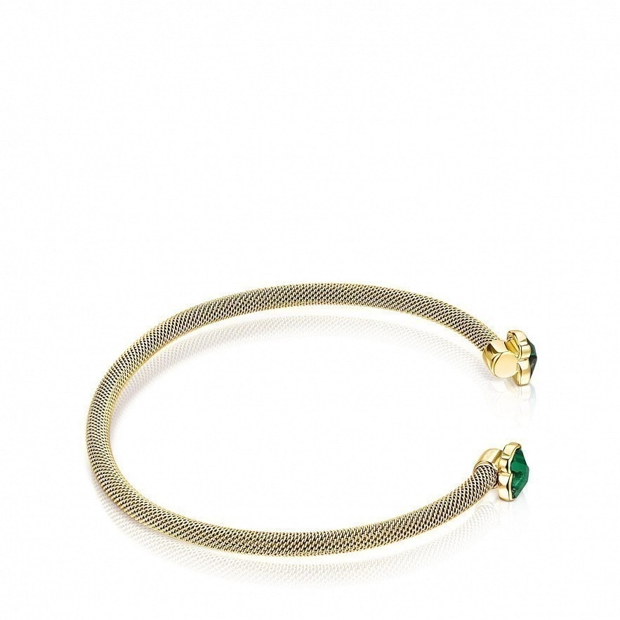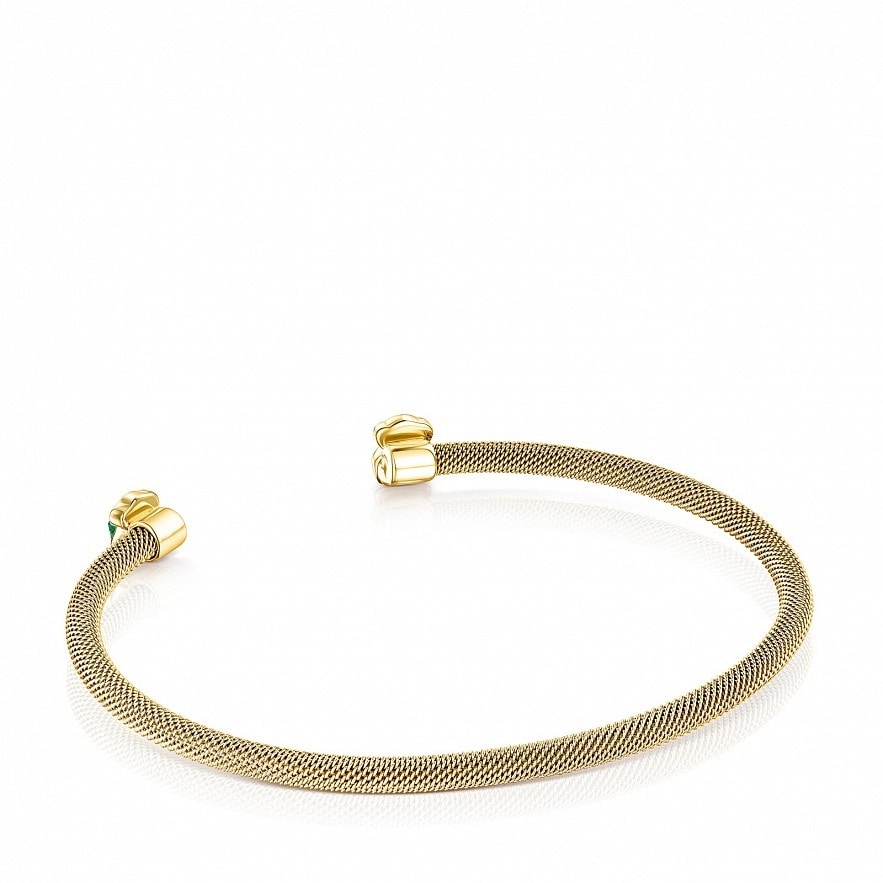 Браслет TOUS Icon Mesh зі сталі з жовтим IP-покриттям, з двома вставками з малахіту, обрамлених сріблом 925 проби з жовтим покриттям Vermeil . Розмір вставки: 0,6 см. Ширина браслету: 3 мм. Vermeil : срібло з покриттям жовтого золота 18kt.