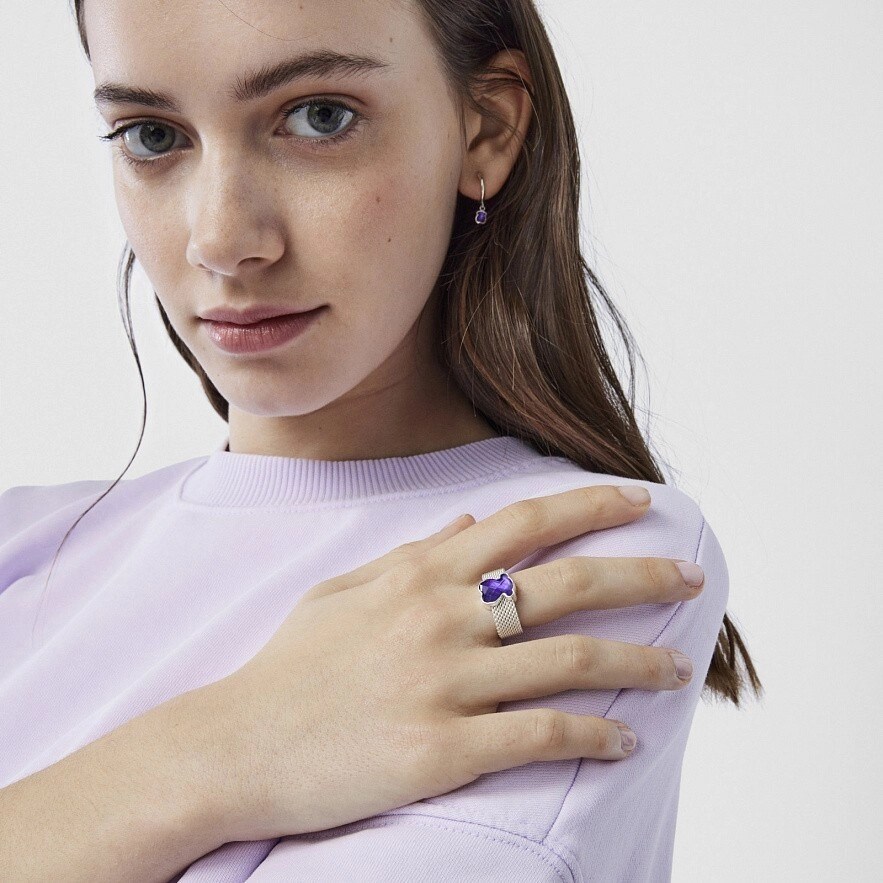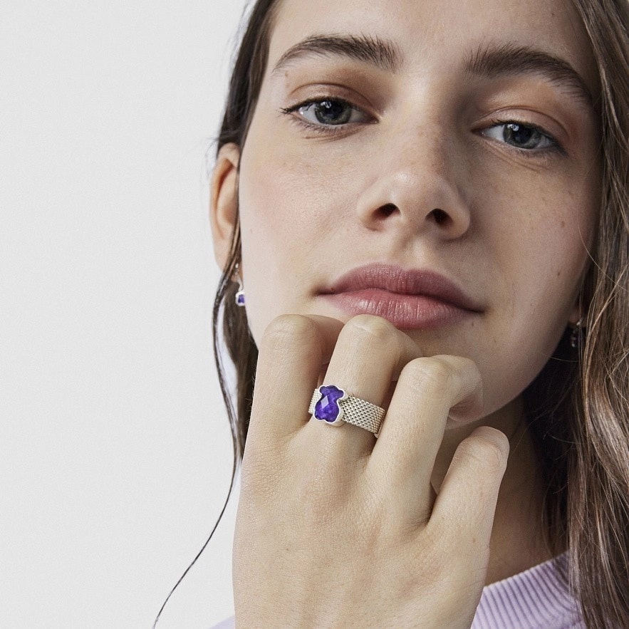 Каблучка TOUS Mesh Color зі срібла 925 проби зі вставкою з аметисту, обрамленою сріблом. Розмір вставки: 1,1 см. Ширина каблучки: 8 мм.