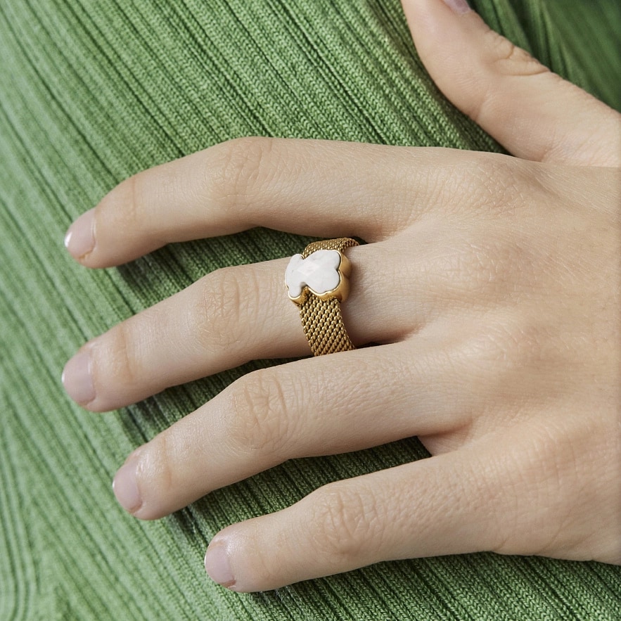 Каблучка TOUS Mesh Color зі сталі з золотим іонним напиленням , вставкою з аметисту, обрамленою сріблом з покриттям золота 18к. Розмір вставки: 1,1 см. Ширина каблучки: 8 мм.