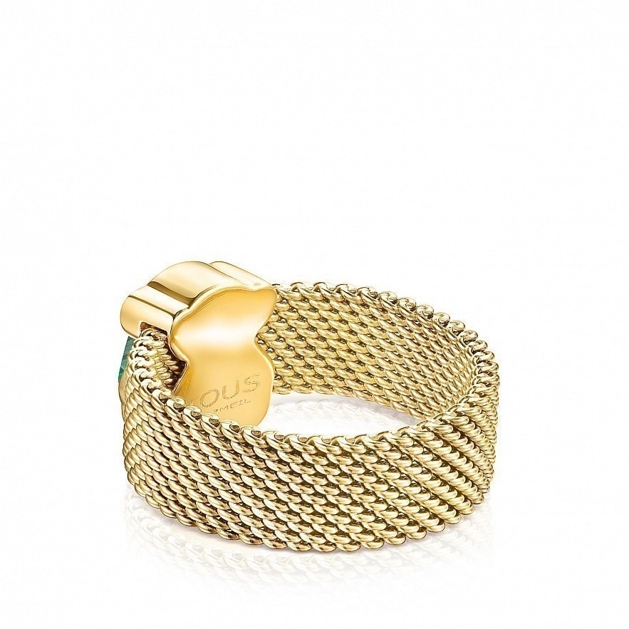 Каблучка TOUS Icon Mesh з сталі з золотистим іонним напиленням, з ведмедиком з малахіту та облямівкою з вермелю. Розмір ведмедика: 1,1 см. Ширина кільця: 8 мм. Срібло вищого гатунку, покрите золотом 18 карат мінімальної товщини від 3 до 5 мікрон, без будь-яких проміжних шарів.