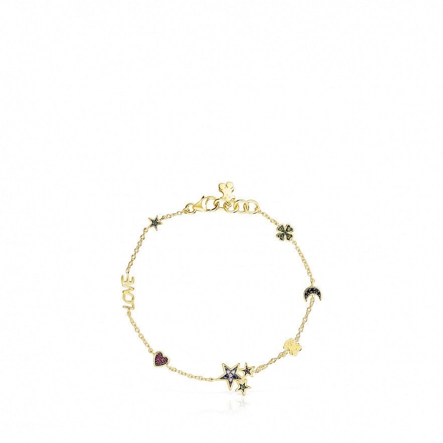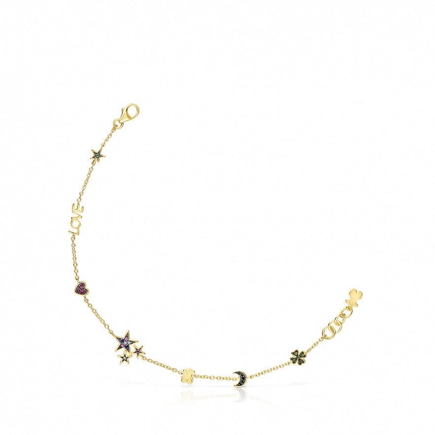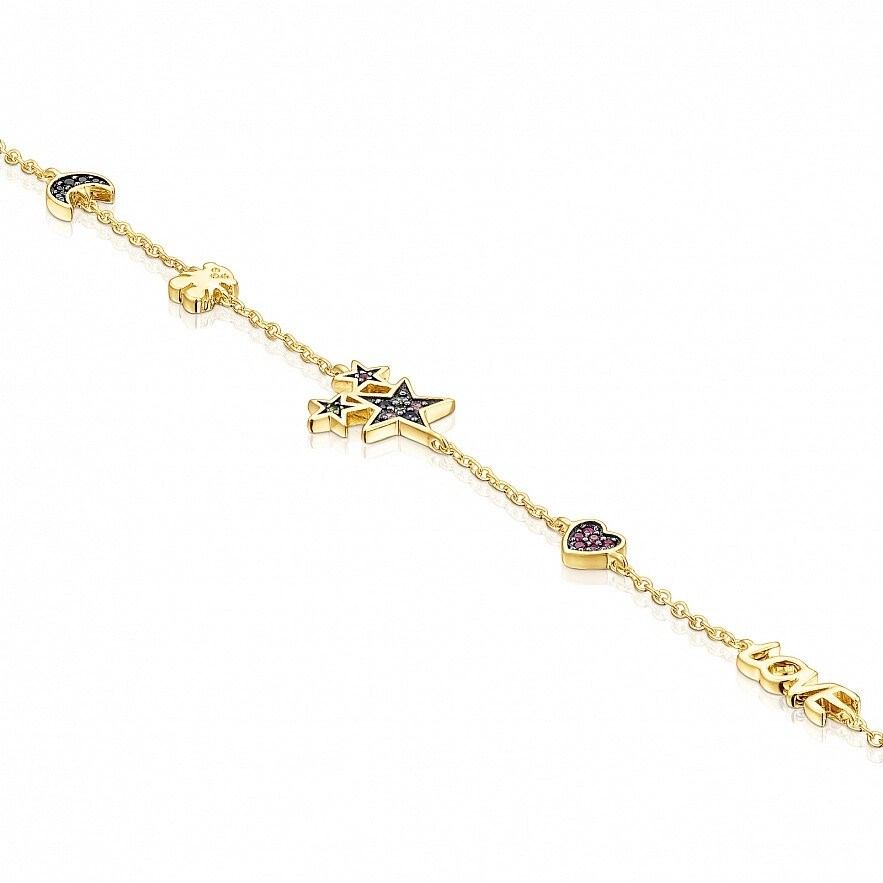 Браслет Teddy Bear зі срібла 925 проби у покритті Vermeil з 7 елементами: чотирилисник зі вставкою діопсиду, місяць зі вставкою шпінелі, ведмідь, різнокольорові сапфірові зірки (рожеві, сині та безбарвні), рубінове серце,напис "ЛЮБОВ" та зірка зі вставкою діопсиду. Розмір оберегів: 0,3–0,9 см. Довжина : 17,5 см.Vermeil : срібло з покриттям золота 18 карат.
