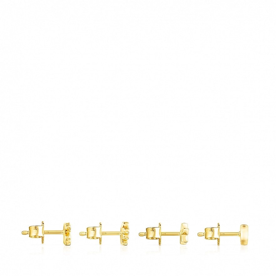 Набір з чотирьох сережок TOUS Teddy Bear зі срібла 925 проби у покритті Vermeil . Форма сережок: чотирилисник зі вставкою діопсиду, серце зі вставкою рубінів, зірка зі вставкою іолітів та ведмедик. Розмір сережок: 0,23–0,5 см. Застібка-пусет. Vermeil : срібло з покриттям золота 18 карат.