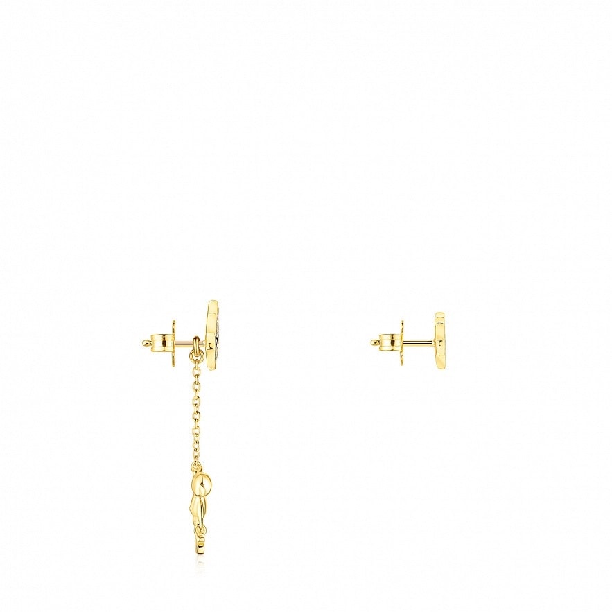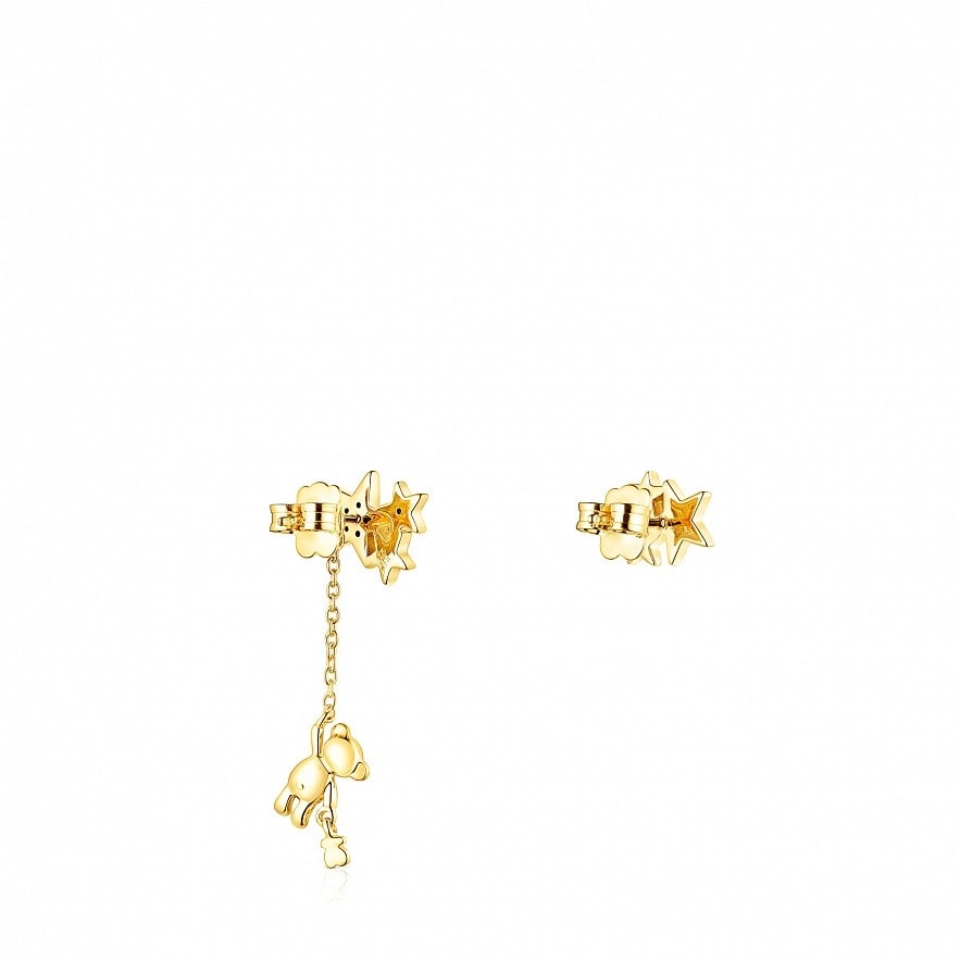 Сережки TOUS Teddy Bear Stars зі срібла 925 проби у покритті Vermeil . Одна коротка сережка у формі 3 зірок: зірки розміром 0,8 см зі вставкою різнокольорових сапфірів (рожевих, синіх та безбарвних), зірки зі вставкою рубінів та зірки зі вставкою іолітів розміром 0,4 см; і одна довга сережка у формі 3 зірок з підвіскою у формі ведмедика розміром 1 см. Застібка-пусет. Vermeil : срібло з покриттям золота 18 карат.