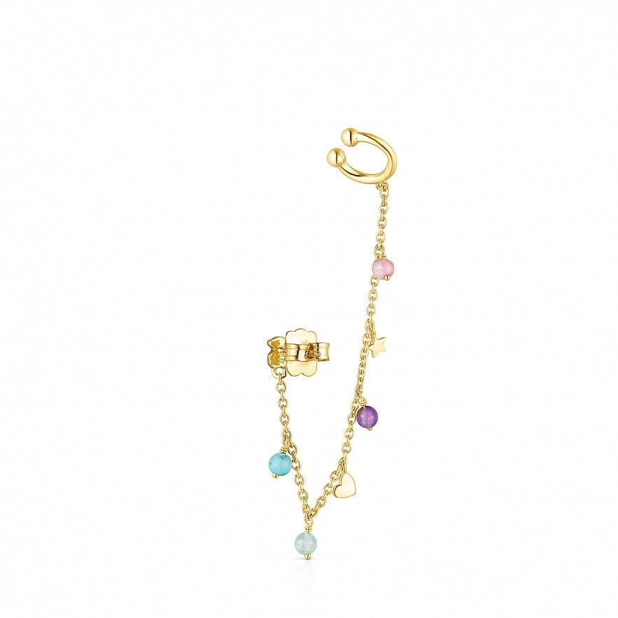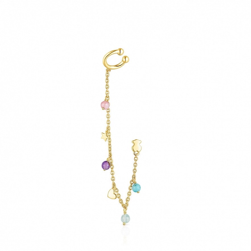 Кафа на одне вухо TOUS Cool Joy із срібла 925 проби з покриттям Vermeil . Підвіски - символи: зірка, серце, ведмідь розміром 0.35 - 0.45 см та дорогоцінне каміння: аметист, авантюрин, гауліт, родохрозит діаметром 0 .28 -0.32 см та перлинами діаметром 0.3 см. Довжина ланцюжка на сережці - 9 см. Даметр кільця для фіксації - 0.95 см.Застібка - пусет.Vermeil : срібло з покриттям золота 18 карат.