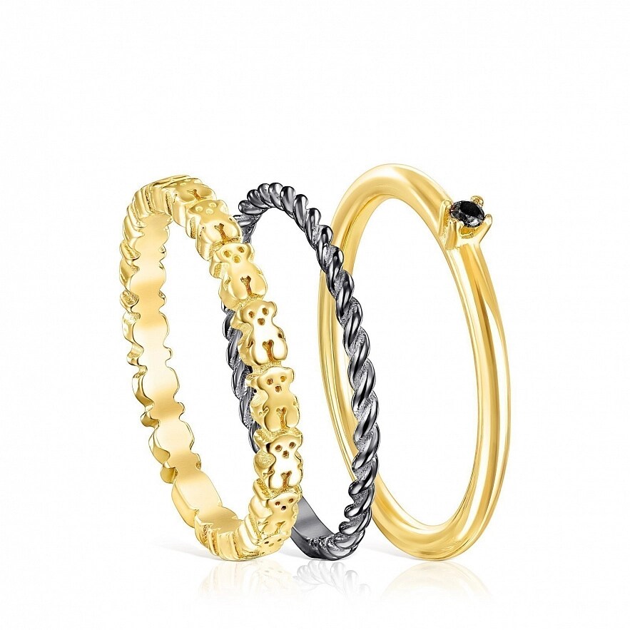 Набір каблучок TOUS Ring Mix зі срібла 925 проби з жовтим покриттям Vermeil з шпінеллю та срібла з покриттям з рутенію. Ширина каблучок: 1.5-2-2.5 мм. Vermeil : срібло 925 проби з покриттям золота 18 карат.