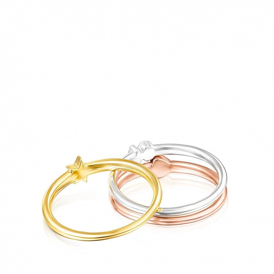 Набір з 3 кілець TOUS Ring Mix із срібла 925 проби, срібла у рожевому та золотом з покриттям Vermeil з декоративними елементами( ведмедик, зірка, серце). Розмір декоративних елементів: 0.4 - 0.45 см. Ширина: 0.23 см.Vermeil : срібло з покриттям золота 18 карат.