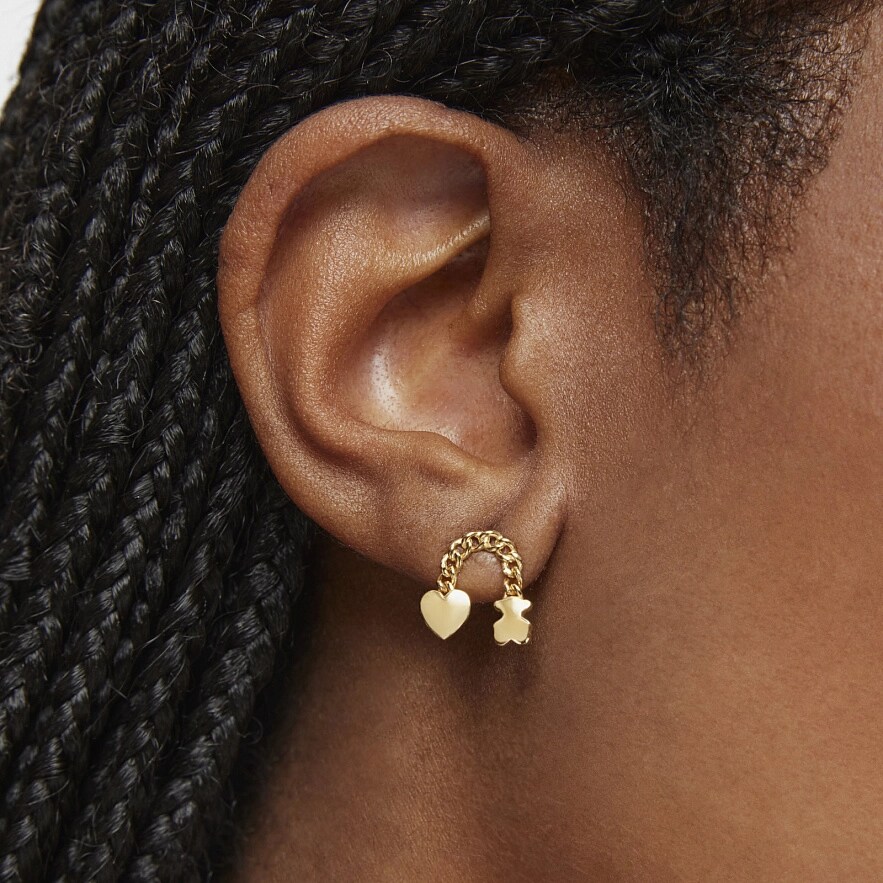 Сережки TOUS Bold Motif зі срібла 925 проби з покриттям Vermeil . Мотиви: ведмедик та серце. Довжина сережок: 14 мм. Розмір мотивів: 5,6 мм.