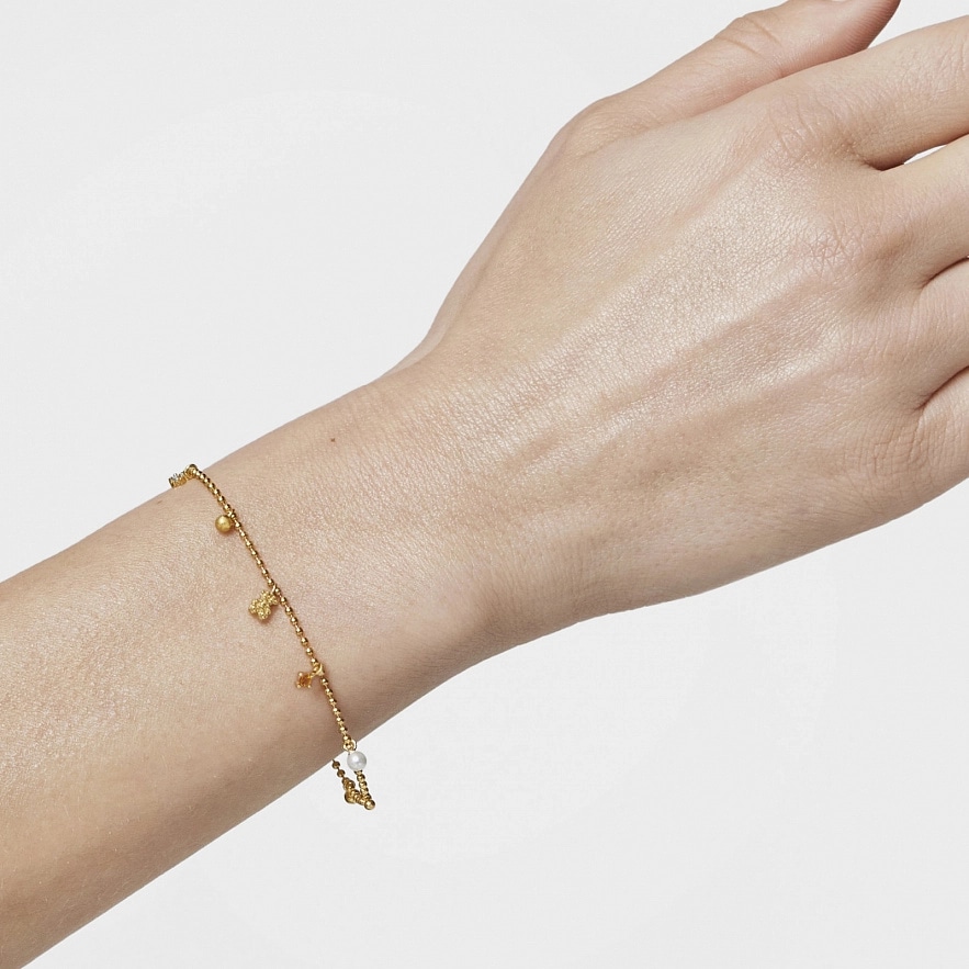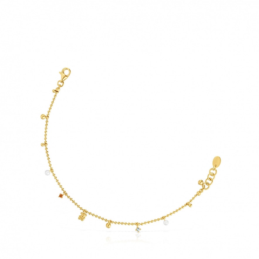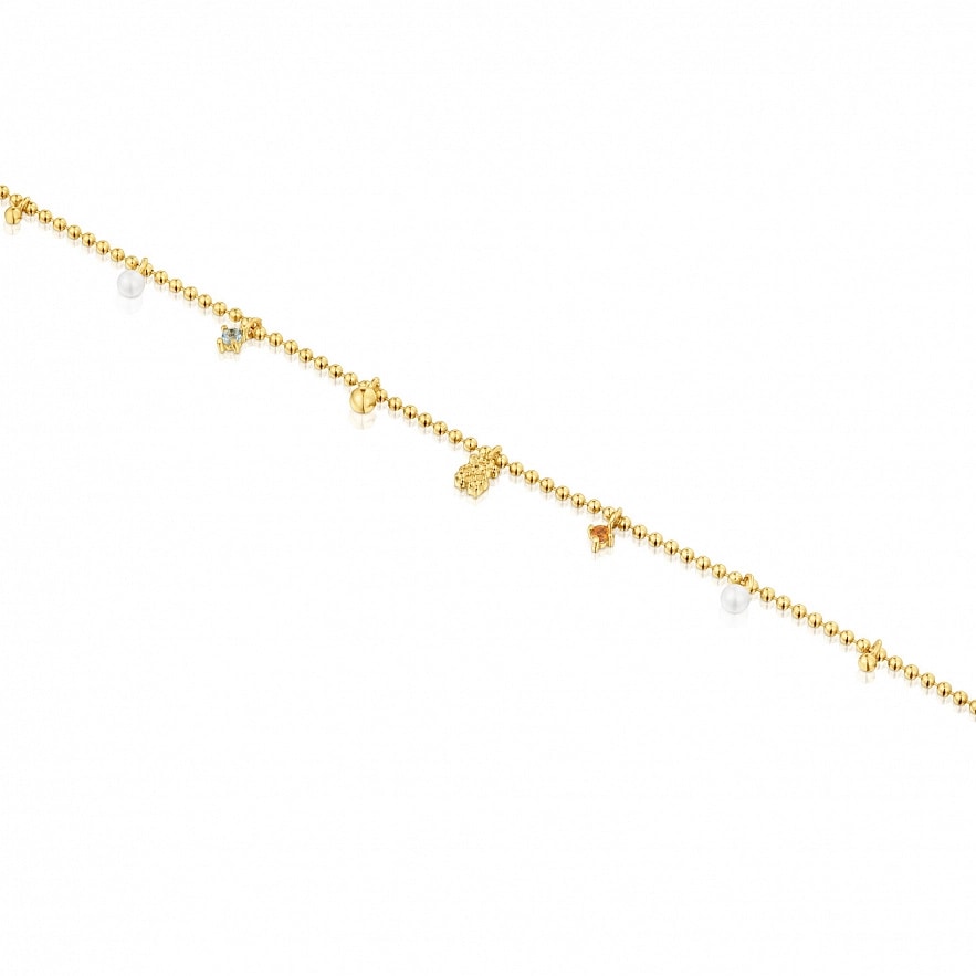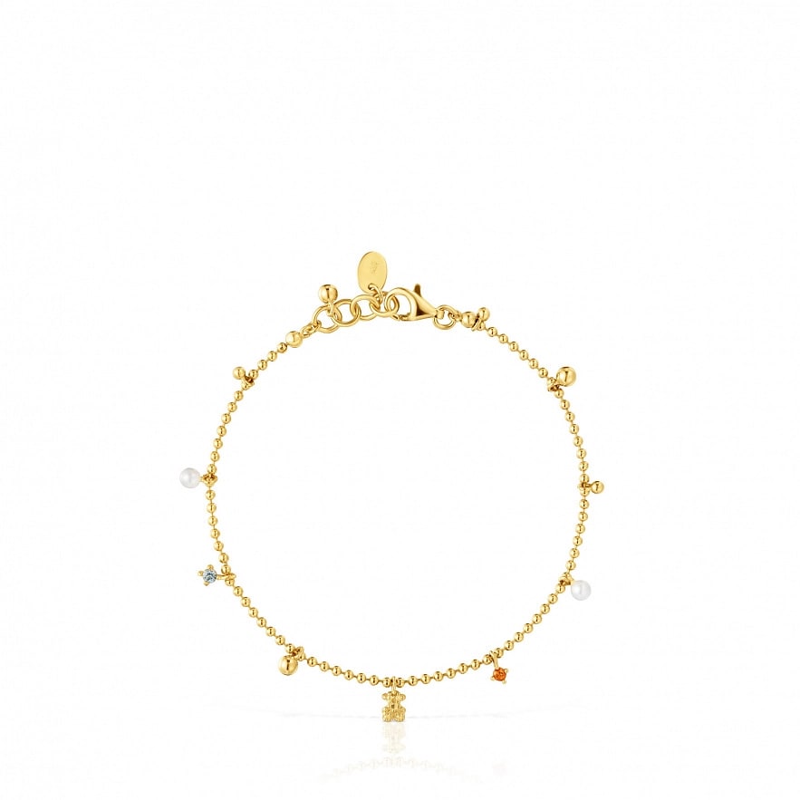 Браслет TOUS Grain з 18-каратним золотим покриттям по сріблу, із ланцюжка та деталями, мотивом ведмедя, прісноводними культивованими перлами та дорогоцінними каменями. Коштовне каміння: синій топаз огранований 2 мм, круглий гранульований помаранчевий гранат 2 мм. Розмір ведмедика: 4,6 мм. Розмір культивованих перлин: 3-3,5 мм. Довжина браслета: 17,5 см. Застібка лобстер. Виріб зі срібла 925 проби з позолотою від 18 до 23 карат товщиною 3 мікрон. Така якість гарантує більшу довговічність прикраси.