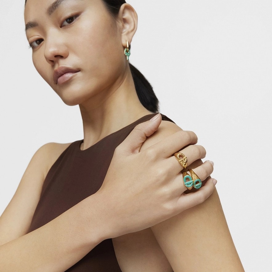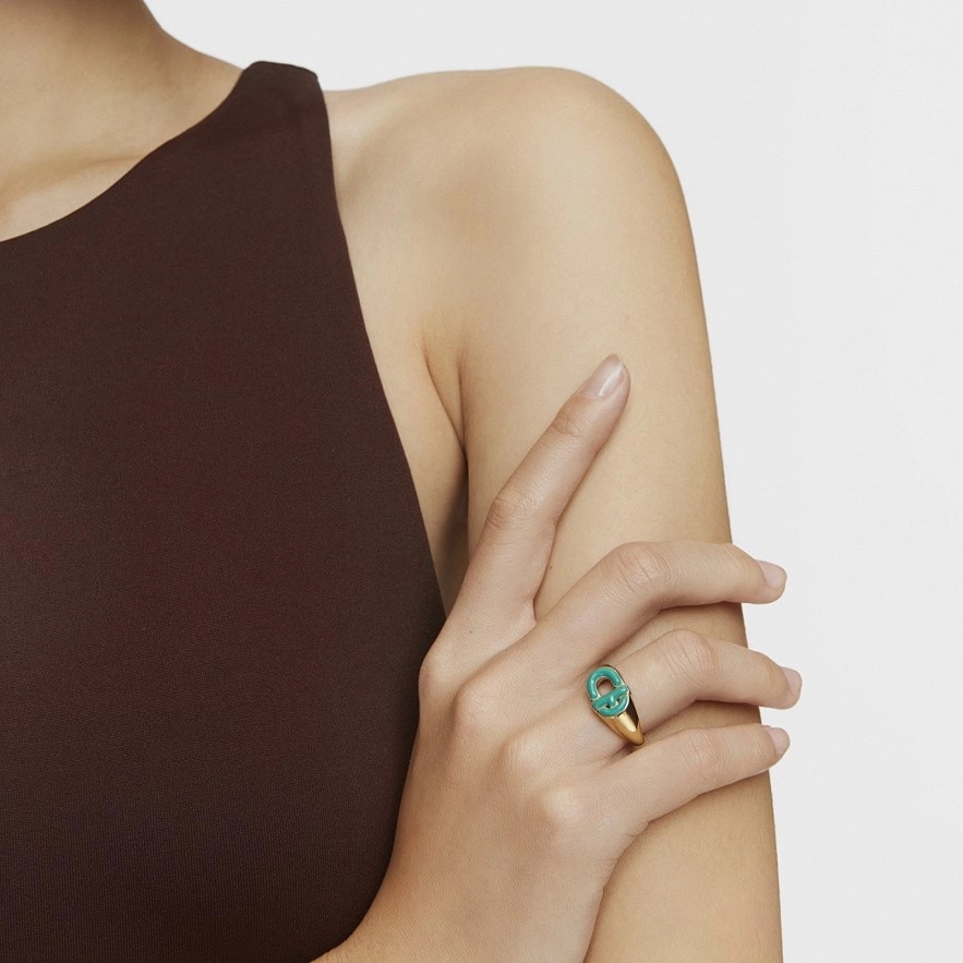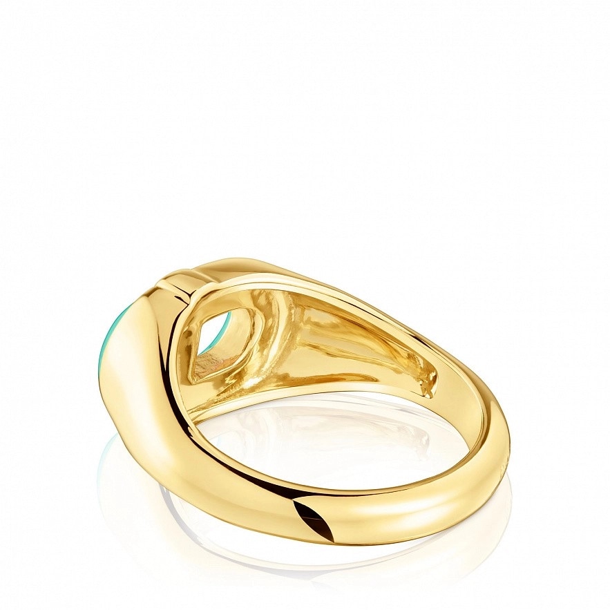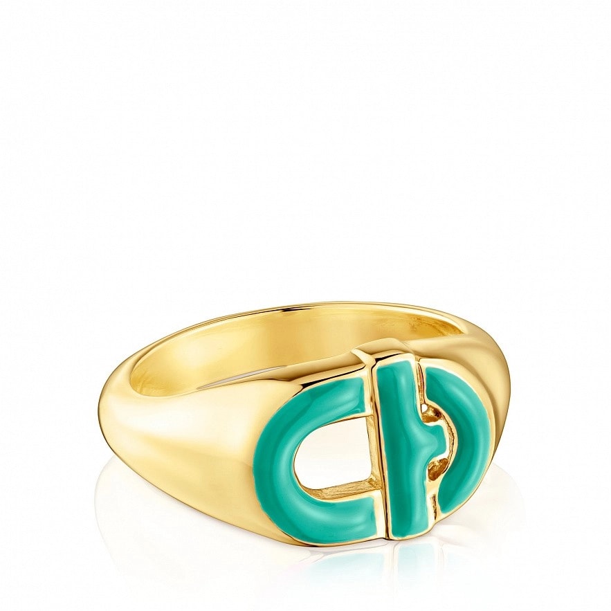 Каблучка-печатка TOUS Manifesto зі срібла 925 проби з покриттям Vermeil з центральним мотивом у зеленій емалі.Розмір мотиву:9,8 х 13 мм.Товщина мотиву:3,6 мм.Товщина каблучки:1,7 мм.