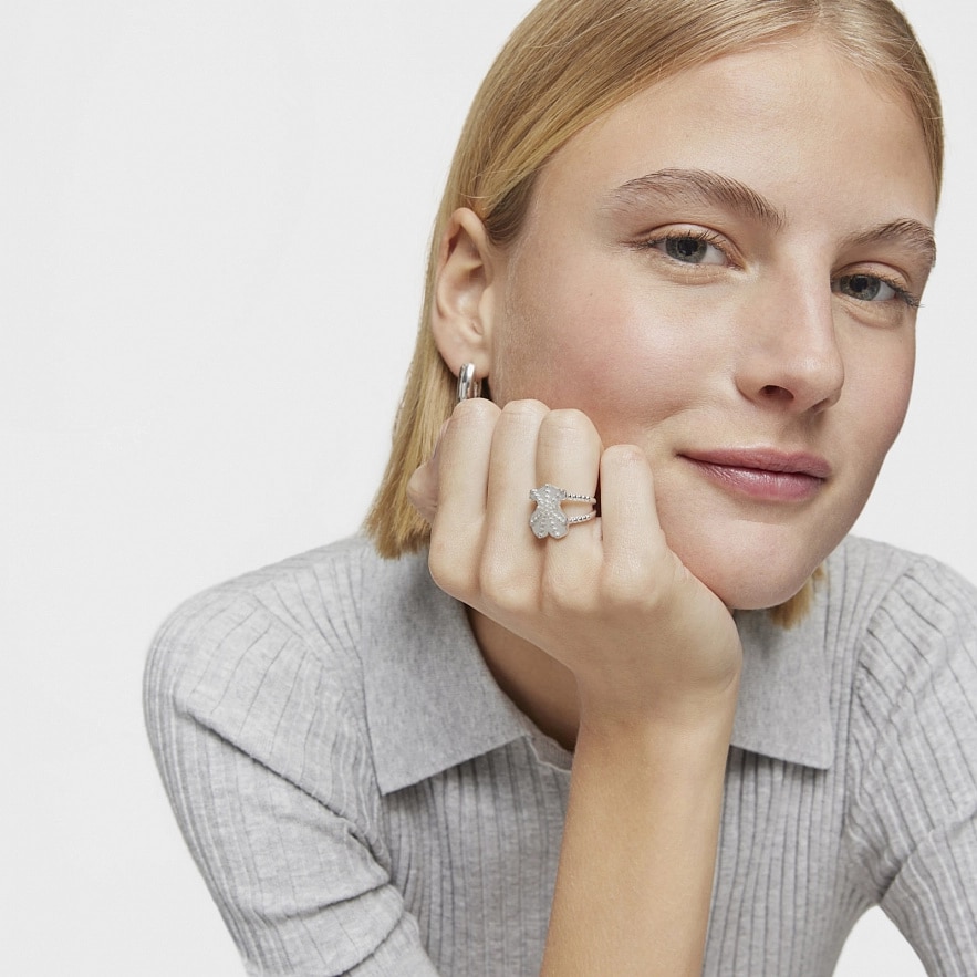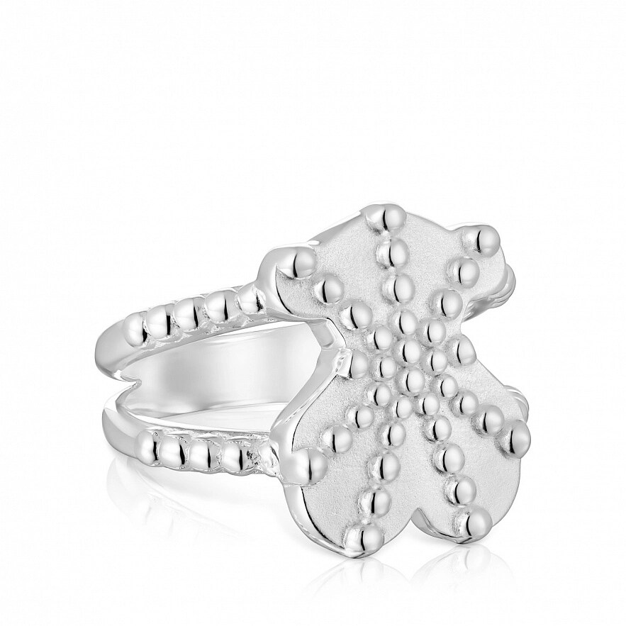 Каблучка TOUS Grain зі срібла 925 проби з мотивом ведмедика. Розмір ведмедика: 15 мм. Ширина каблучки: 15 мм. Товщина каблучки: 1,75 мм.