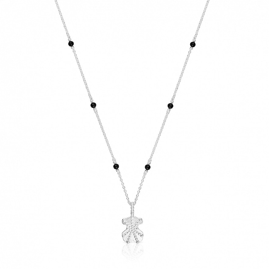 Намисто TOUS Grain зі срібла 925 проби, переплетені шарми з круглого огранованого оніксу та підвіска з ведмедиком. Розмір ведмедика: 15 мм. Розмір дорогоцінного каміння: 3,5-4 мм. Довжина намиста: 40-45 см. Застібка - пружинне кільце.