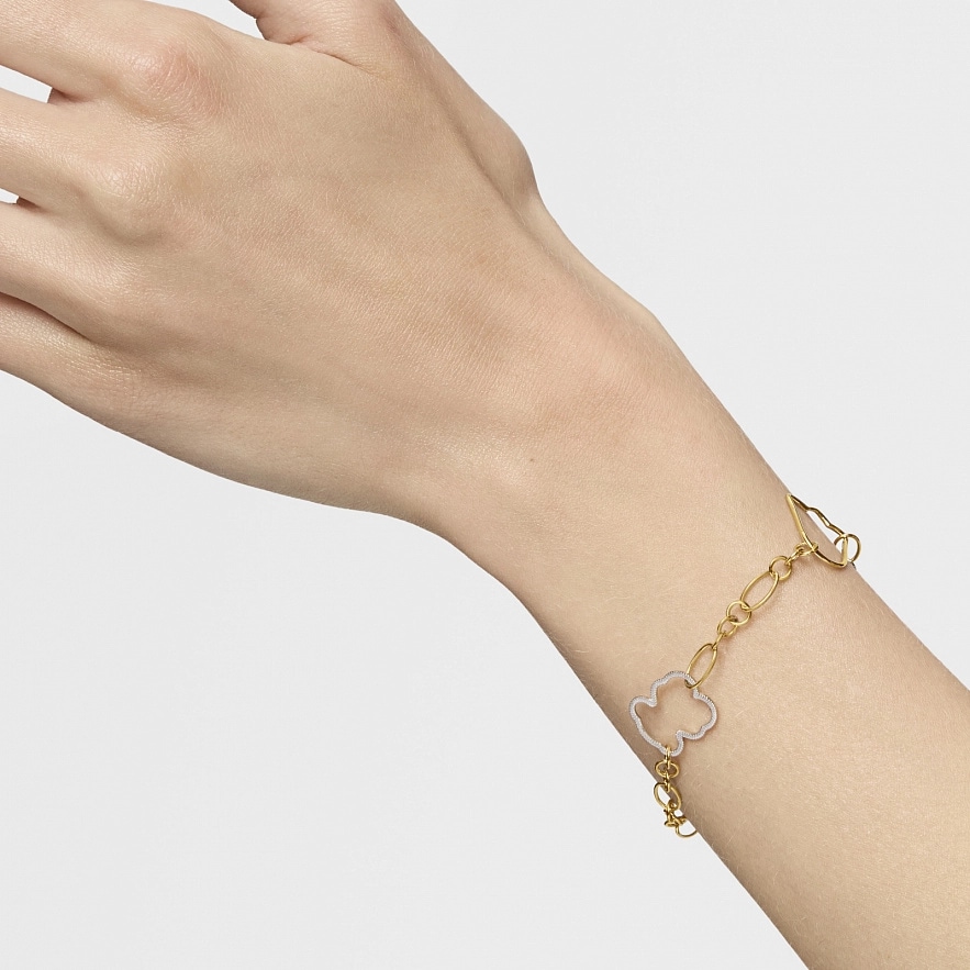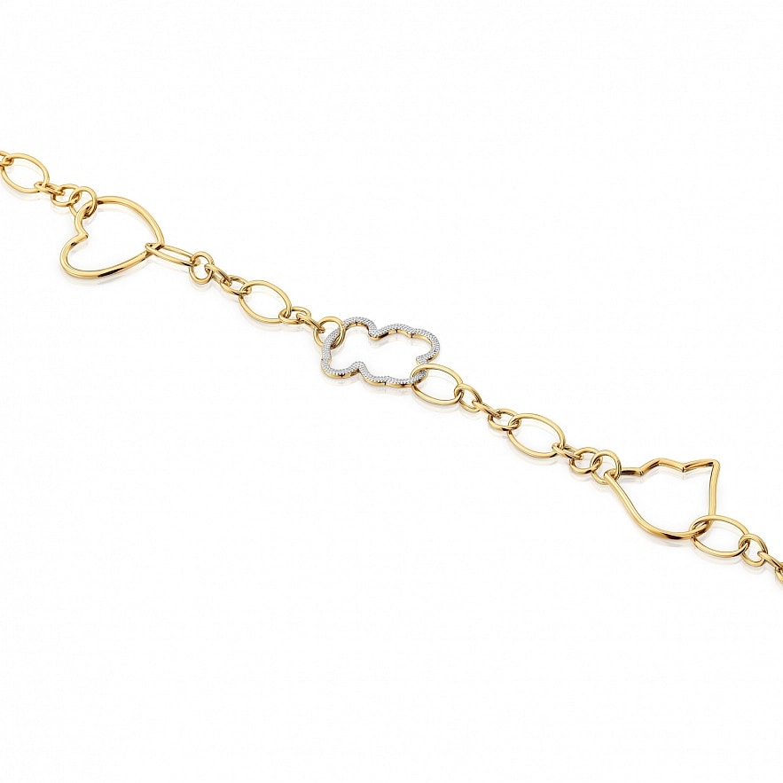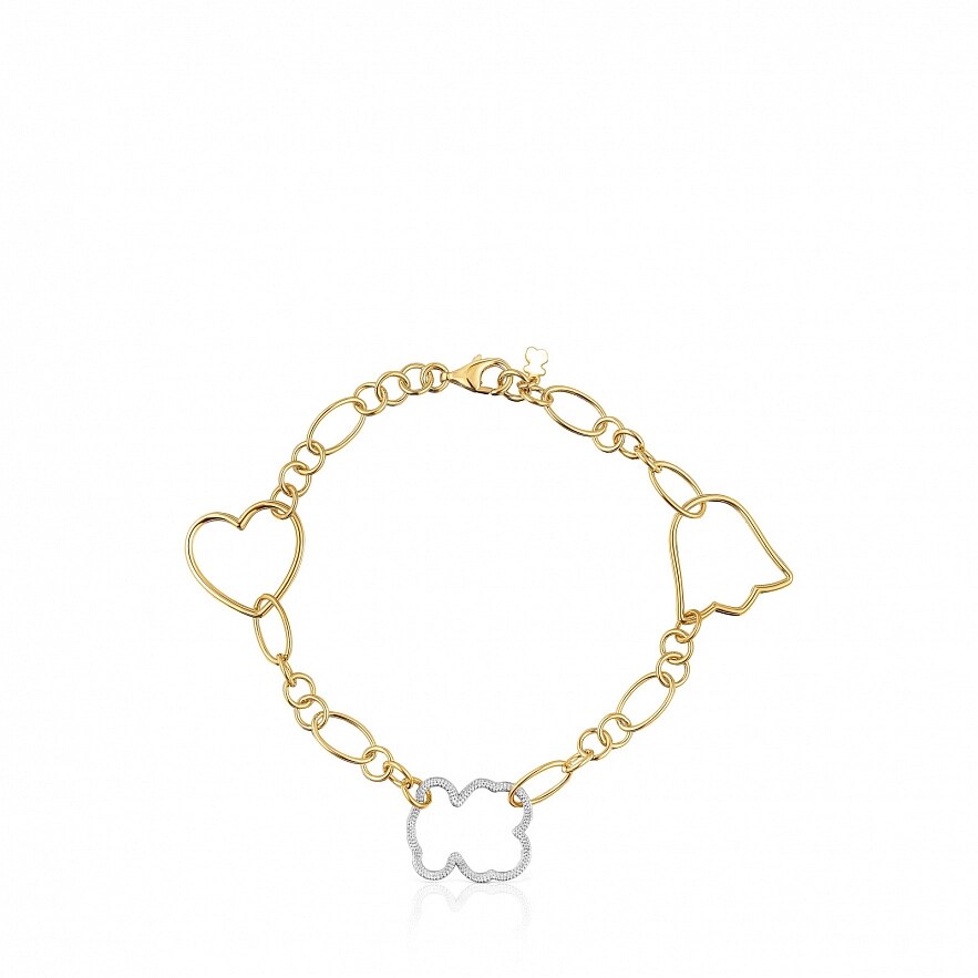 Браслет TOUS New Silueta зі срібла 925 проби з покриттям Vermeil з декоративною технікою фрезерування, з білим родієвим покриттям і мотивами. Мотиви: тюльпан 16 мм, серце 14,5 мм та ведмедик 16 мм з гранульованого срібла. Довжина браслета: 18 см. Застібка у вигляді лобстера.