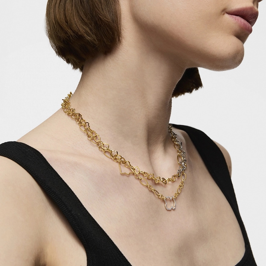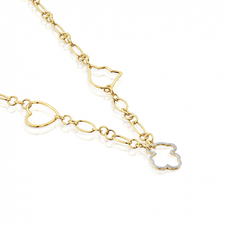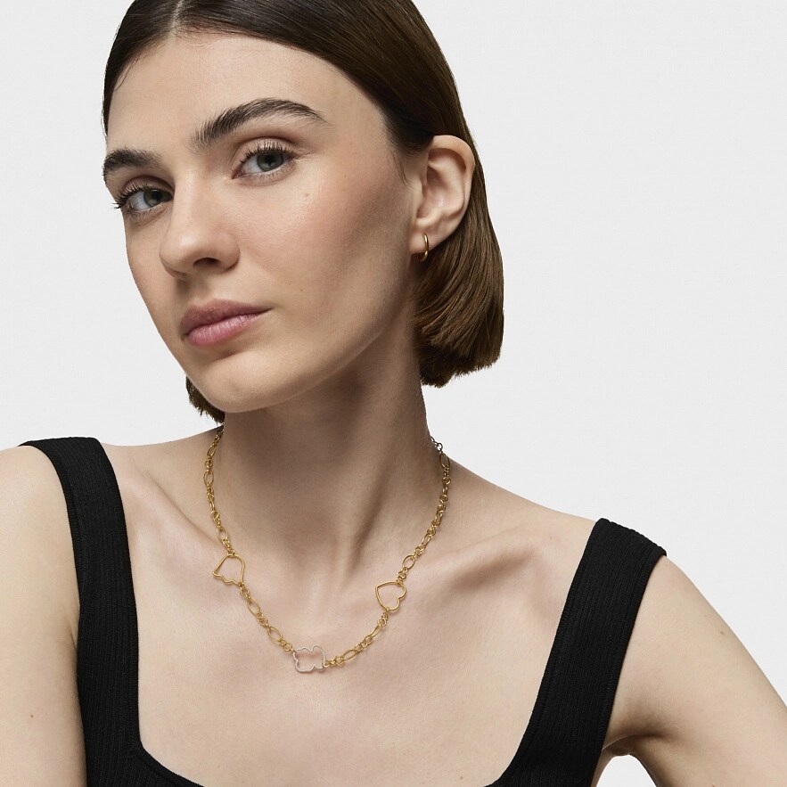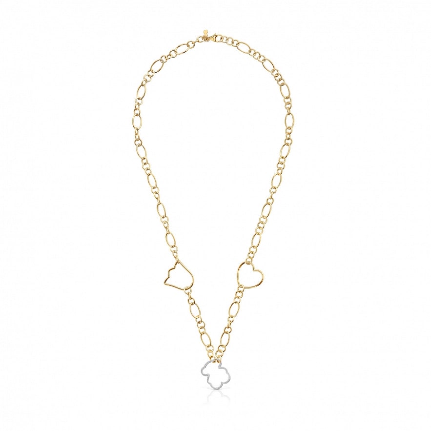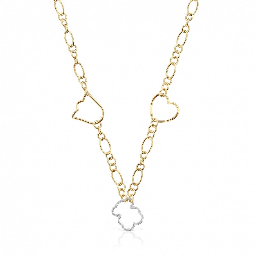 Намисто TOUS New Silueta зі срібла 925 проби з покриттям Vermeil з декоративною технікою фрезурування, з білим родієвим покриттям і мотивами. Мотиви: тюльпан 16 мм, серце 14,5 мм та ведмедик 16 мм з гранульованого срібла. Довжина кольє: 44 см. Застібка лобстер.