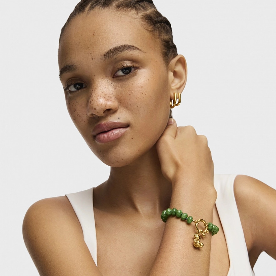 Браслет TOUS Hold Oval зі срібла 925 проби з покриттям Vermeil та обробленого зеленого кварциту. Розмір каменю: 8 мм. Загальна довжина: 17,5 см. Примітка: як застібку можна поєднувати з кулонами з колекції Hold або Hold Oval.