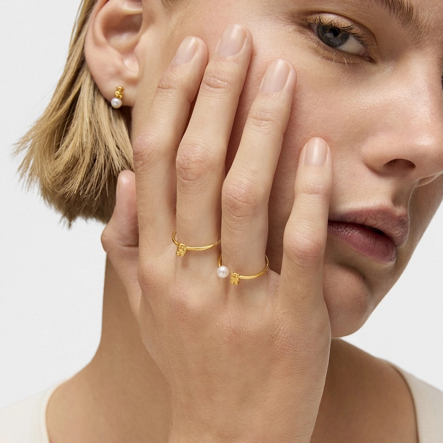 Каблучка TOUS Bold Bear з 18-каратного жовтого золота з мотивом ведмедика і культивованою прісноводною перлиною. Розмір культивованої перлини: 4,5 мм. Розмір ведмедя: 5 мм. Товщина каблучки: 2,3 мм.