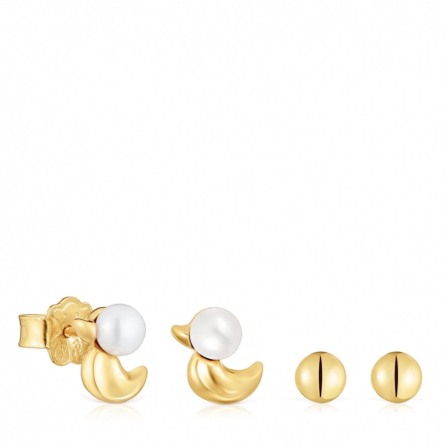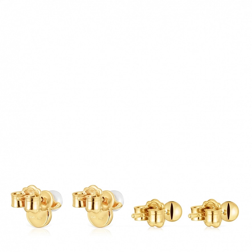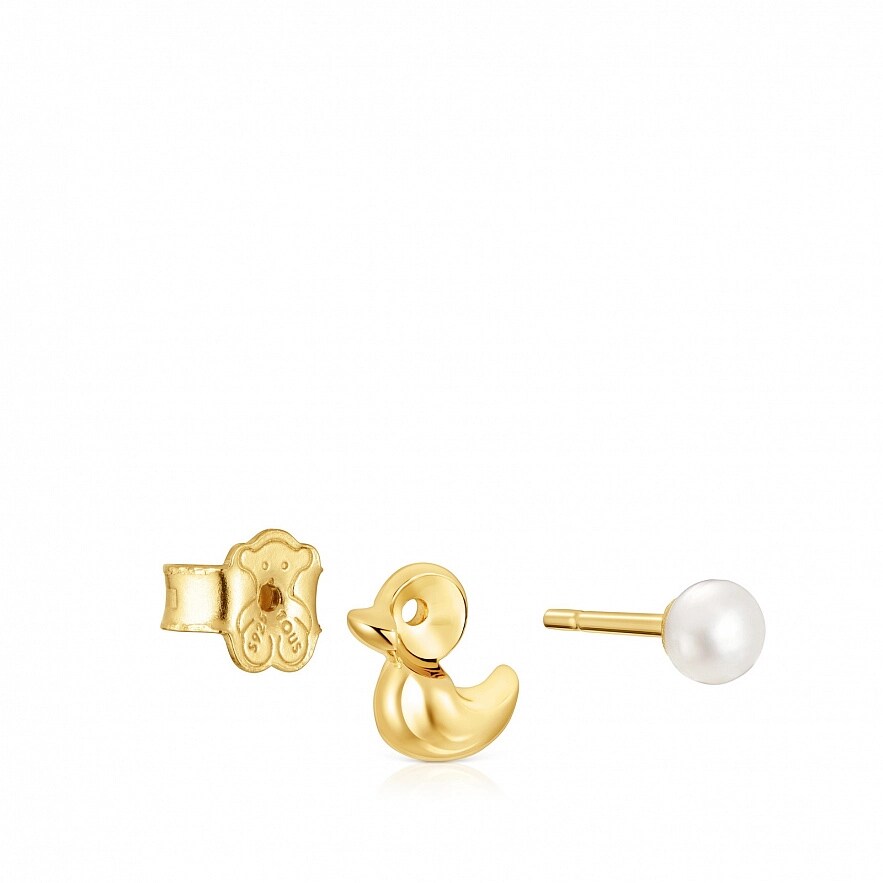 Набір сережок TOUS Virtual Garden зі срібла 925 проби з покриттям Vermeil та культивованими перлами. Основа сережки у формі качечки без застібки; взаємозамінні між двома різновидами сережок. Одна сережка у формі кульки з 18-каратним золотим покриттям, а інша з культивованою прісноводною перлиною. Розмір культивованих перлин: 3.2 мм. Розмір шарму: 3,2 мм. Застібка-пусет.