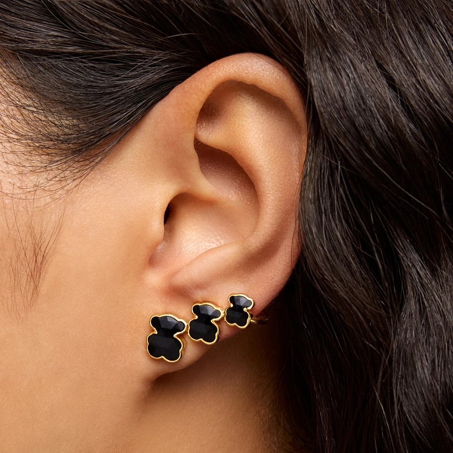 Сережки TOUS Icon Color зі срібла 925 проби з покриттям Vermeil з огранованим оніксом у формі ведмедика. Розмір ведмедиків: 6 мм, 7,5 мм та 9 мм. Розмір сережок: 25 мм.