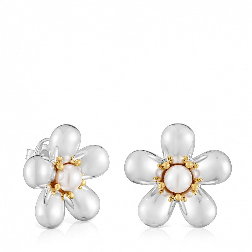 Сережки TOUS Daisy зі срібла 925 проби з покриттям Vermeil з квітковим мотивом та культивованими прісноводними перлинами. Розмір культивованої перлини: 7-7,5 мм. Розмір сережки: 27 мм.
