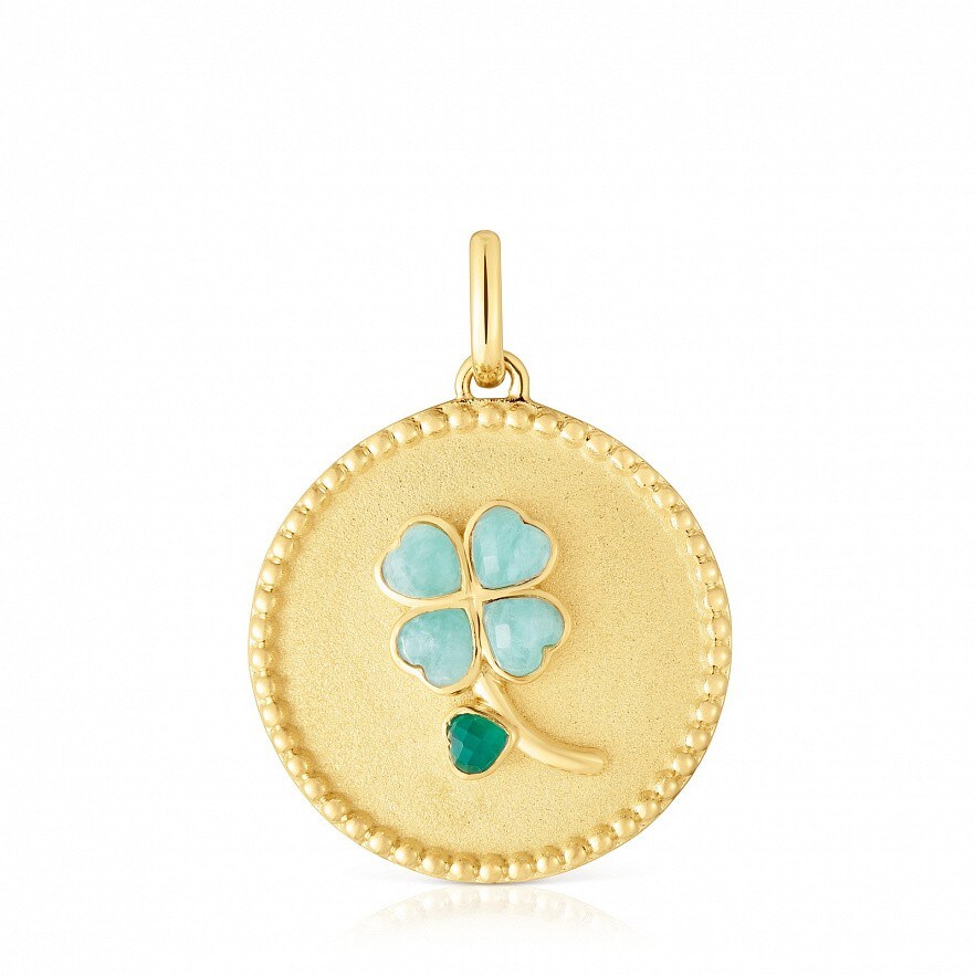 Кулон TOUS Daisy зі срібла 925 проби з покриттям Vermeil , амазонітом у формі серця та зеленим халцедоном у формі серця з огранюванням у вигляді троянди. Розмір кулона: 24 мм. Цей виріб не включає в себе ланцюжок.