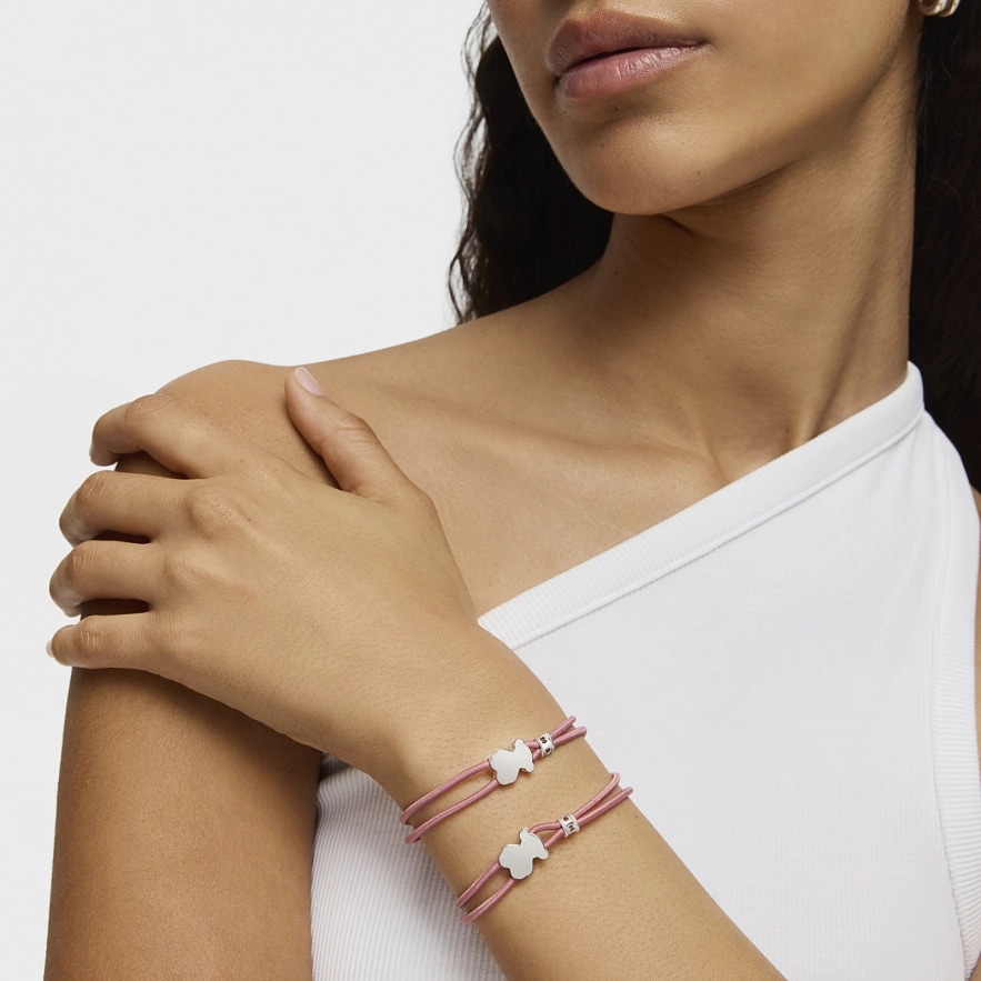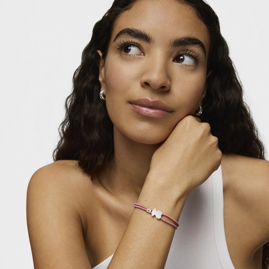 Еластичний браслет TOUS Sweet Dolls рожевого кольору, розміром 17 см з шармом зі срібла 925 проби. Техніка виготовлення: Лиття. Розмір ведмедика: 11 х 8 мм.