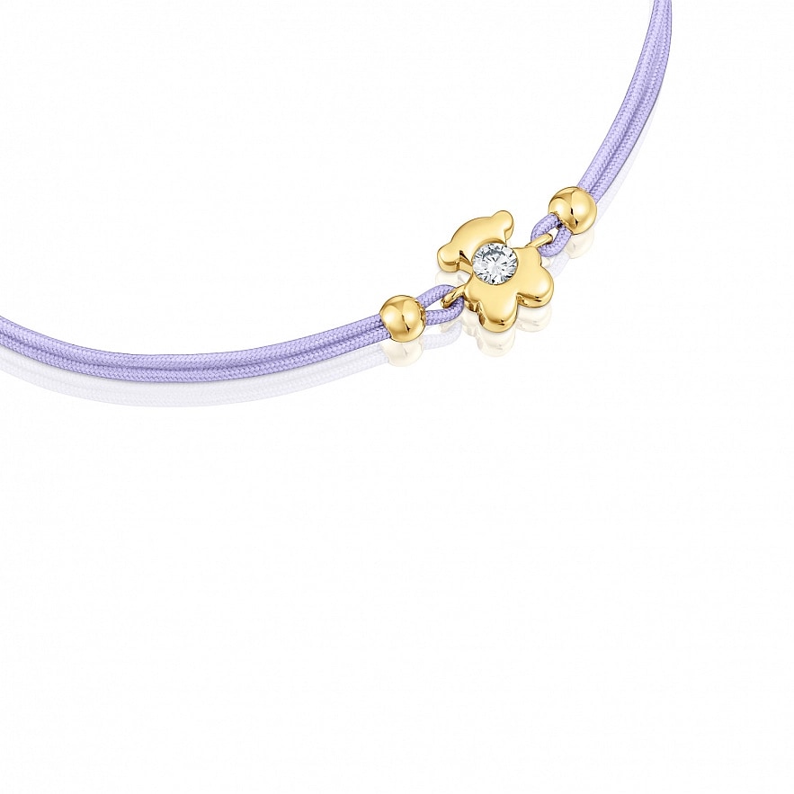 Браслет TOUS Lili Motives LGD з мотивом ведмедика з 14-каратного жовтого золота з діамантом 0.10 карата, вирощеним в лабораторії, і бузковим нейлоном. Якість діаманта: G/VS. Розмір мотиву: 6 мм. Довжина браслета: 17 см. Якість діамантів: G/VS. Застібка-слайдер. Виріб створений з діамантами, вирощеними в лабораторії. Tracemark гарантує простежуваність усіх матеріалів, які йдуть на виготовлення цього виробу, а також місце його виробництва, і має документальне підтвердження цього.