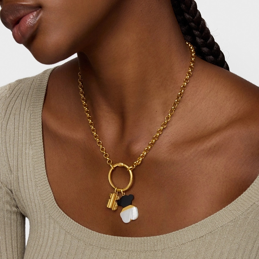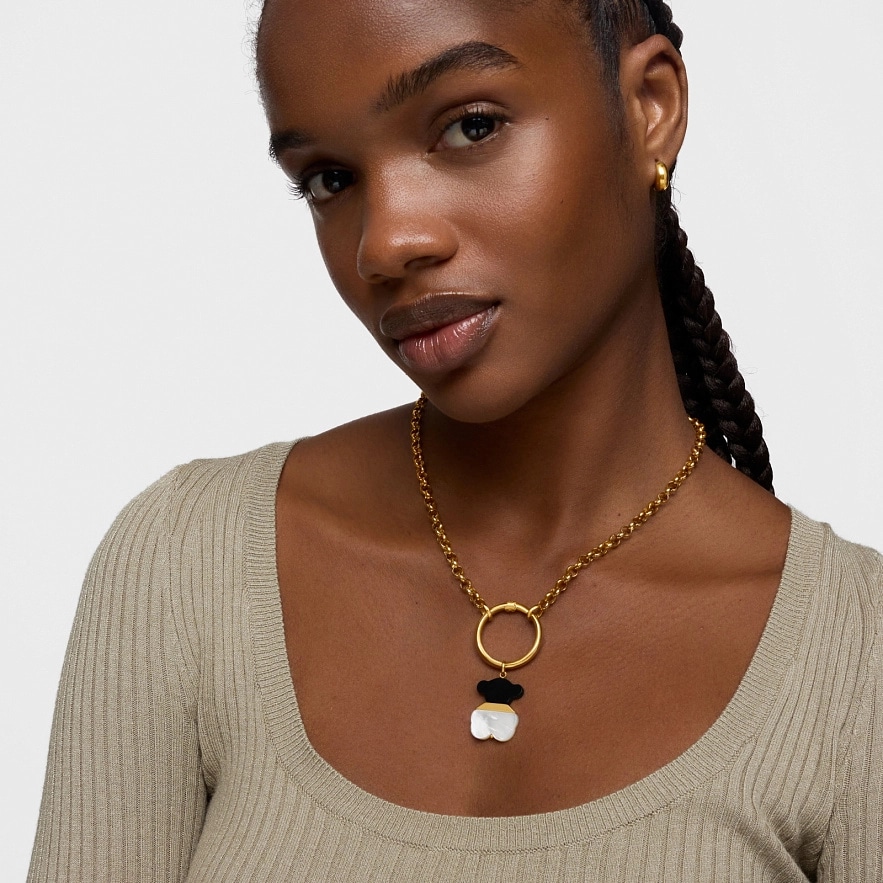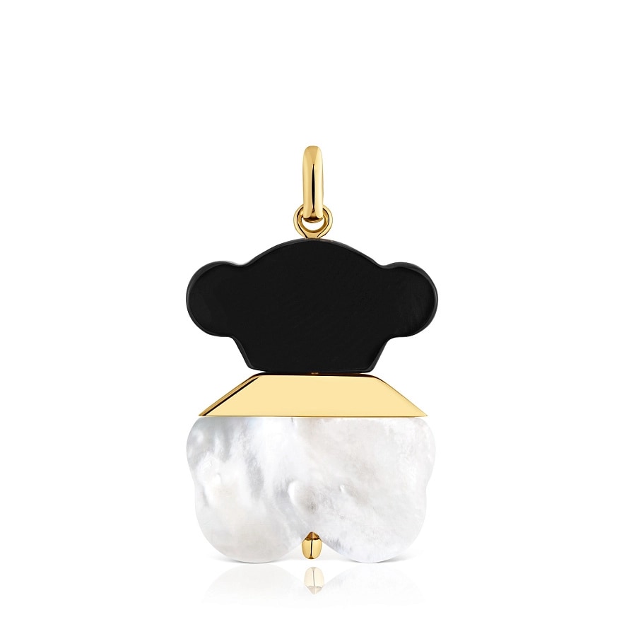 Кулон TOUS Sweet Dolls зі срібла 925 проби з покриттям Vermeil , з перламутром та оніксом у формі ведмедика. Розмір підвіски: 25 мм. Цей виріб не включає в себе ланцюжок.