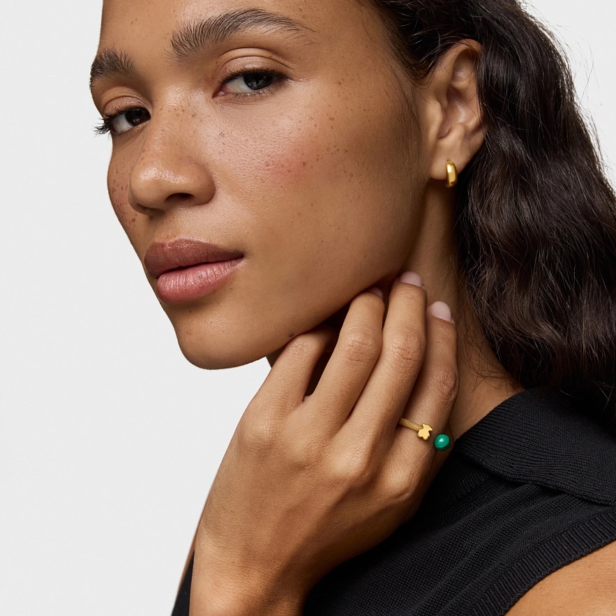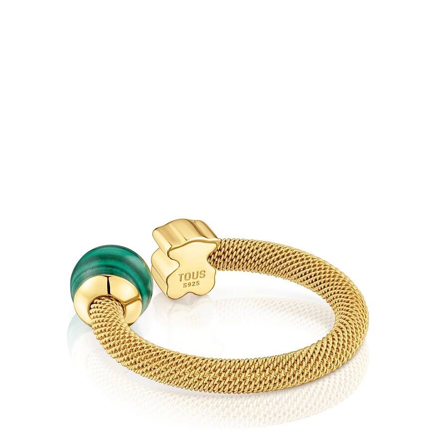 Каблучка TOUS Icon Mesh зі сталі та срібла 925 проби з покриттям Vermeil з мотивом ведмедика та кулькою з малахиту. Розмір мотиву: 6 мм. Товщина каблучки: 2,75 мм.