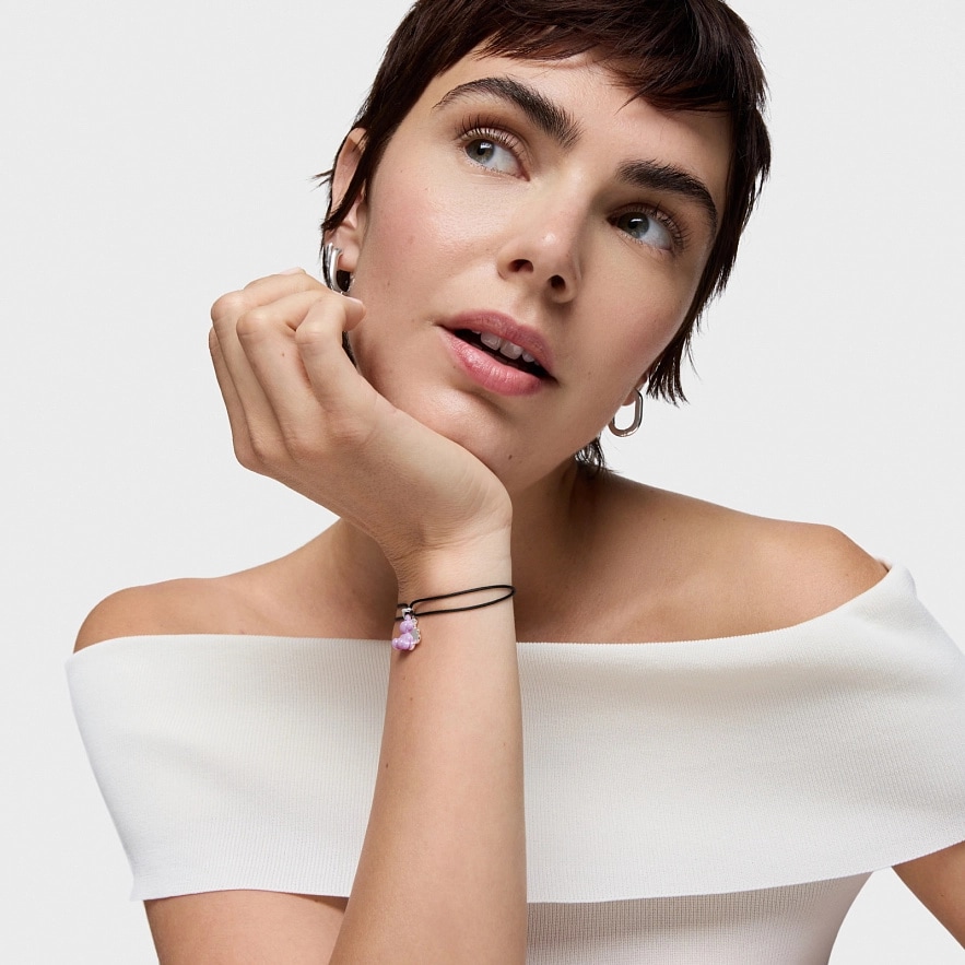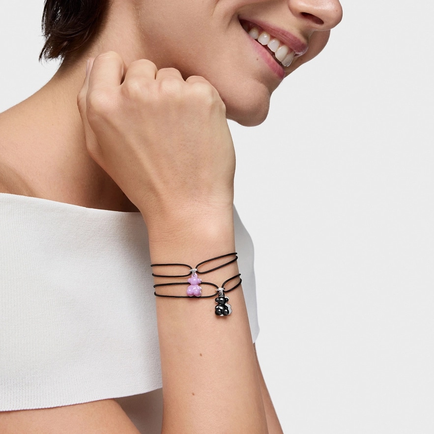 Браслет TOUS Bold Bear з чорного нейлону з мотивом ведмедика з кераміки пастельно-бузкового кольору та підвіскою зі срібла 925 проби. Розмір підвіски: 11 мм. Довжина браслета: 17 см. Застібка-слайдер.