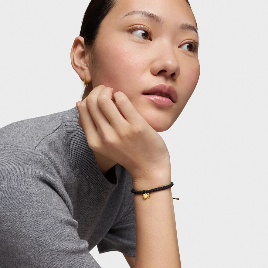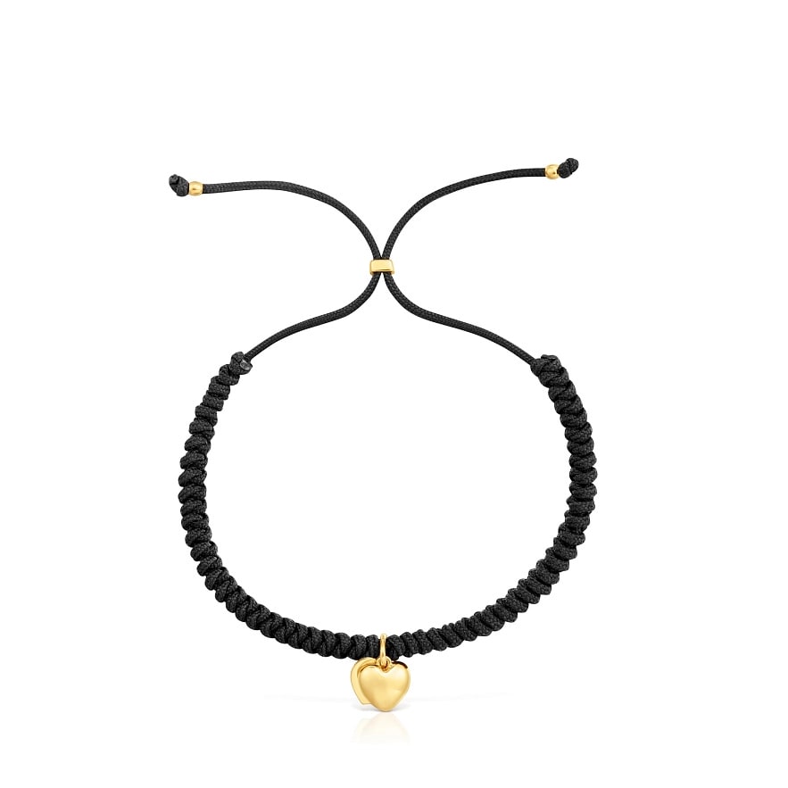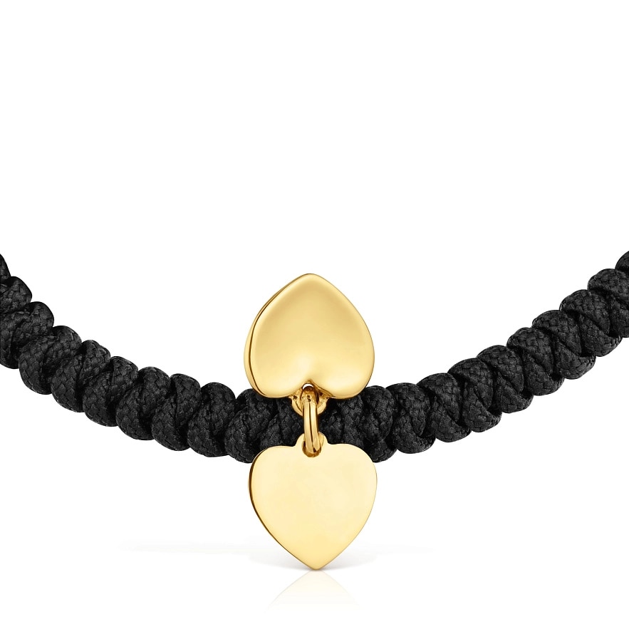 Браслет TOUS Flechazo з 14-каратного жовтого золота з мотивом подвійного серця та чорним нейлоном. Розмір мотиву: 7 мм. Довжина браслета: 23 см. Застібка-слайдер.