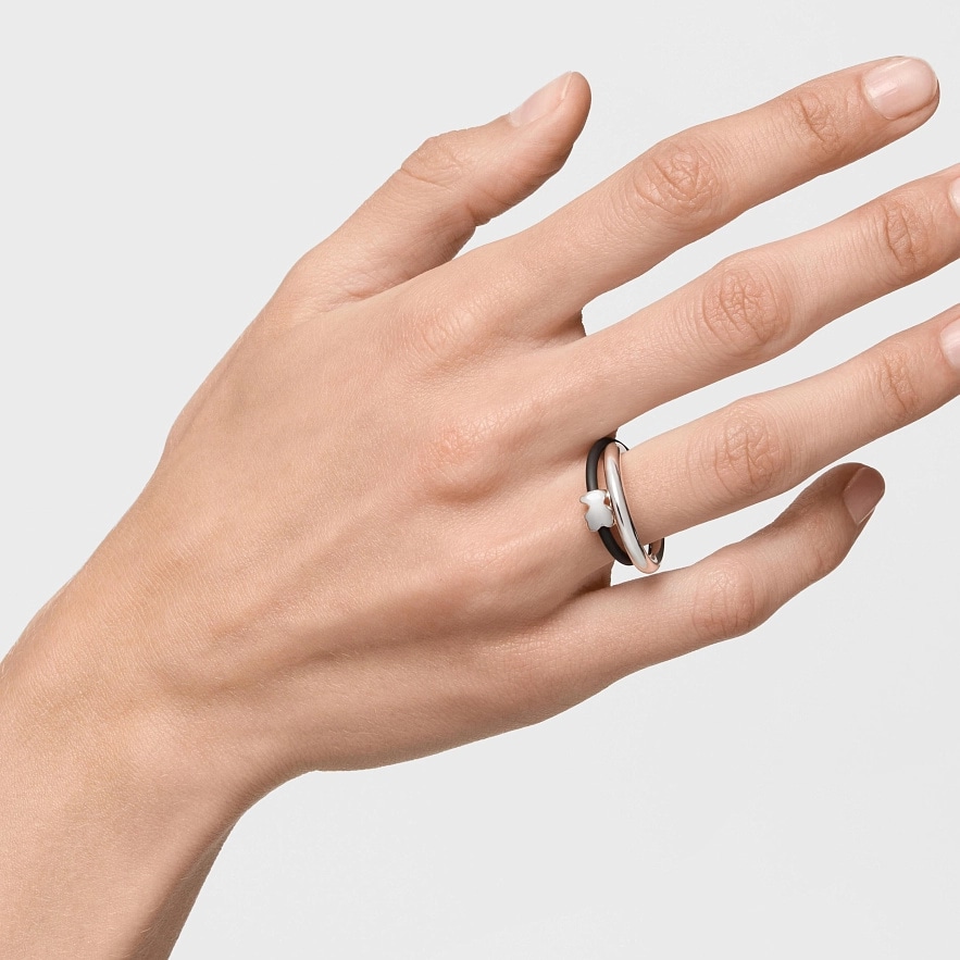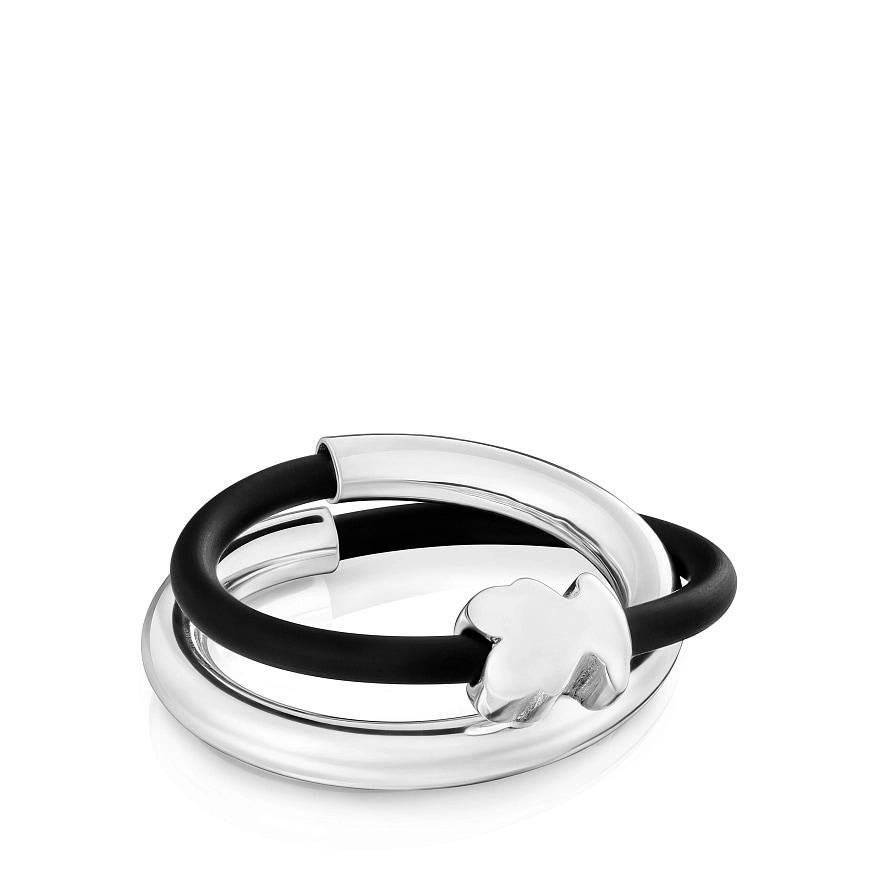 Подвійна каблучка TOUS Bold Motif зі срібла та чорним каучуком з мотивом ведмедя. Розмір мотиву: 7 мм.