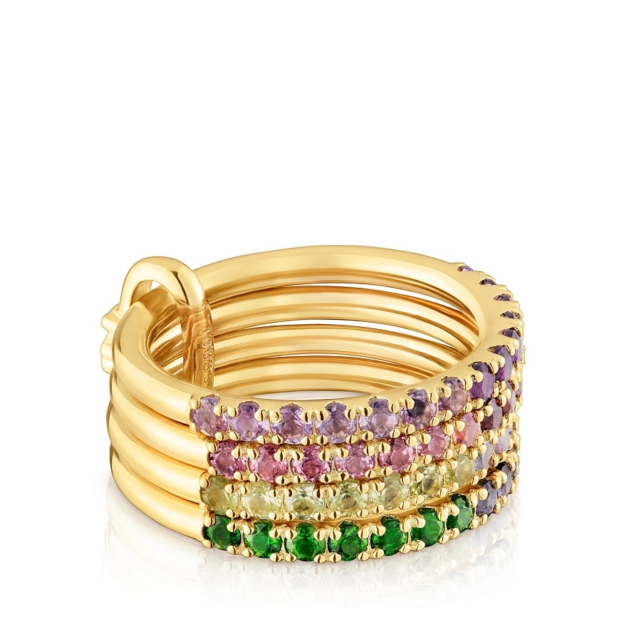 Каблучка TOUS Straight зі срібла з позолотою 18 карат, з мотивом ведмедя та огранованими круглими дорогоцінними каменями. Дорогоцінні камені: хромовий діопсид, родоліт, танзаніт, аметист, перидот та іоліт. Розмір мотиву: 8 мм. Виріб виготовлений зі срібла 925 проби з 18-23-каратним золотим покриттям товщиною 3 мікрони. Ця якість гарантує більшу довговічність ювелірних виробів.