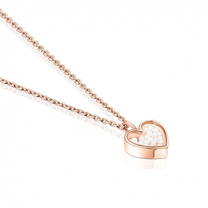 Кольє Areia у формі серця зі срібла 925 проби з покриттям Vermeil рожевого кольору з фрагментами культивованих прісноводних перлів діаметром 1,25 мм. Розмір серця: 10 мм. Довжина кольє: 45 см, з кільцем на 40 см. Vermeil : срібло з покриттям золота 18 карат.