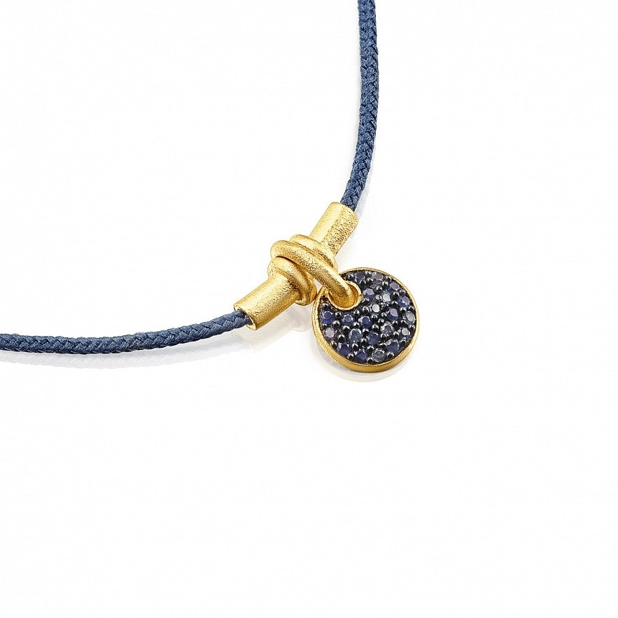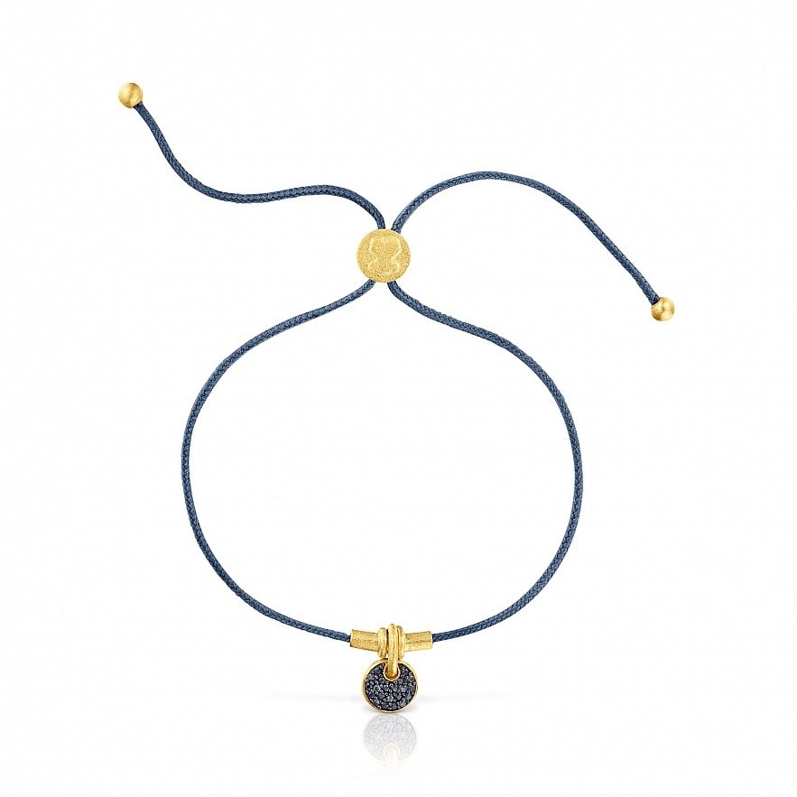 Браслет у формі повного місяця TOUS Luah зі срібла 925 проби з покриттям Vermeil та блакитними сапфірами різних відтінків з закріпкою паве на блакитному родієвому покритті та синьому шнурі. Розмір місяця: 7 мм. Довжина регулюється за допомогою повзунка: 25,5 см. Vermeil : срібло з покриттям золота 18 карат.