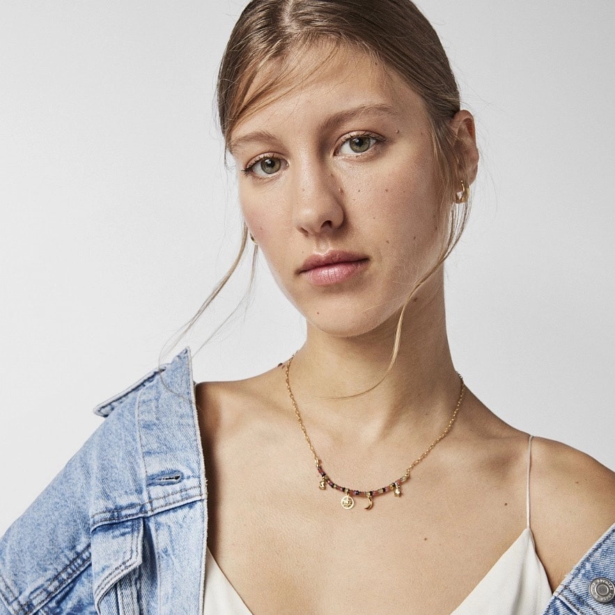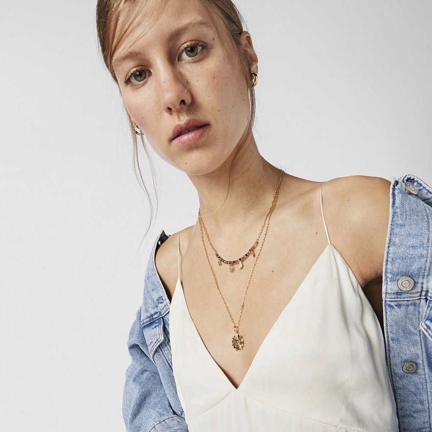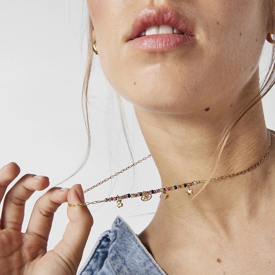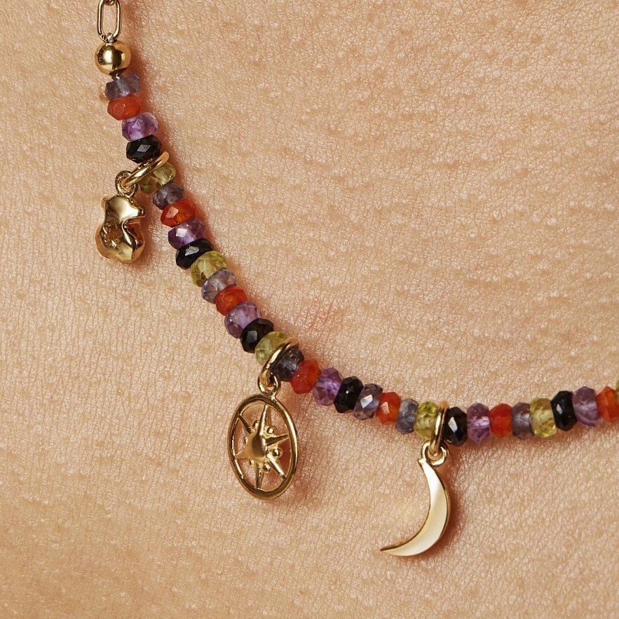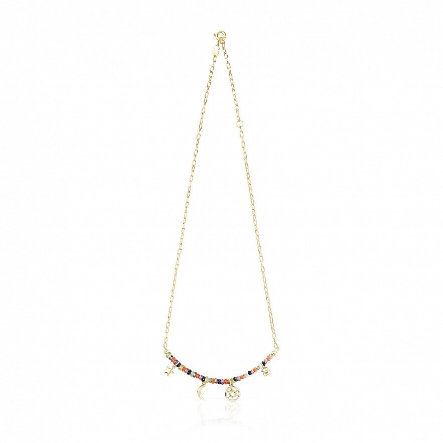 Намисто TOUS Magic Nature зі срібла 925 проби з покриттям Vermeil із зіркою 6-9.5 мм, місяцем, сонцем і ведмедиком з аметистом 3.5 мм, димчастим кварцем, іолітом, перидотом та сердоліком. Довжина намиста: 45 см, з кільцем 40 см. Vermeil : срібло з покриттям золота 18 карат.