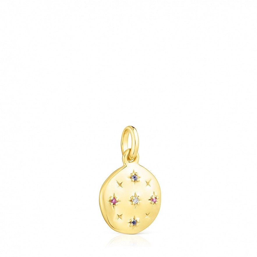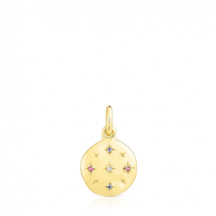 Підвіска TOUS Magic Nature у формі диска зі срібла 925 проби з покриттям Vermeil з двома рубінами 1 мм, двома іолітами 1 мм та зіркою з діамантів L / I огранки «вісімка», загальною вагою 0.008 ct. Розмір: 12 мм. Підвіска не включає ланцюг. Vermeil : срібло з покриттям золота 18 карат.