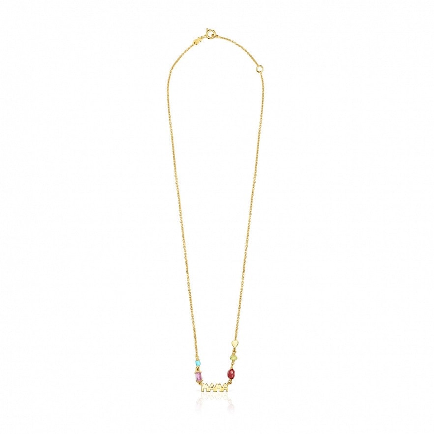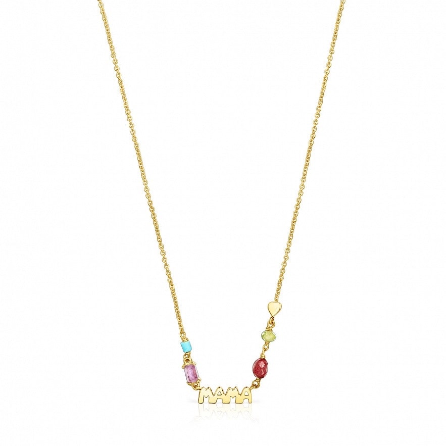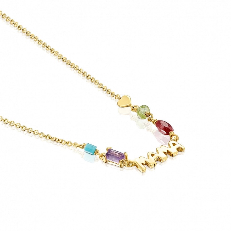 Намисто TOUS Mama зі срібла 925 проби з покриттям Vermeil з огранованим «бубликом» з перидота 3,7 мм, огранованим овальним кабошоном з рубіна 5,5 х 4 мм, багетом з аметисту 5 х 3 мм, трубкою і сердечком з обробленої бірюзи 3 х 2,5 мм. Розмір літер: 15 мм. Довжина кольє: 45 см, з кільцем на 42 см. Vermeil : срібло з покриттям золота 18 карат.