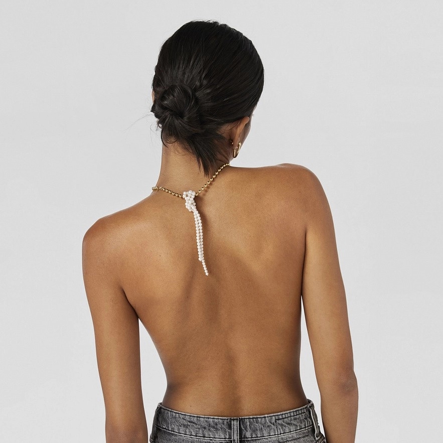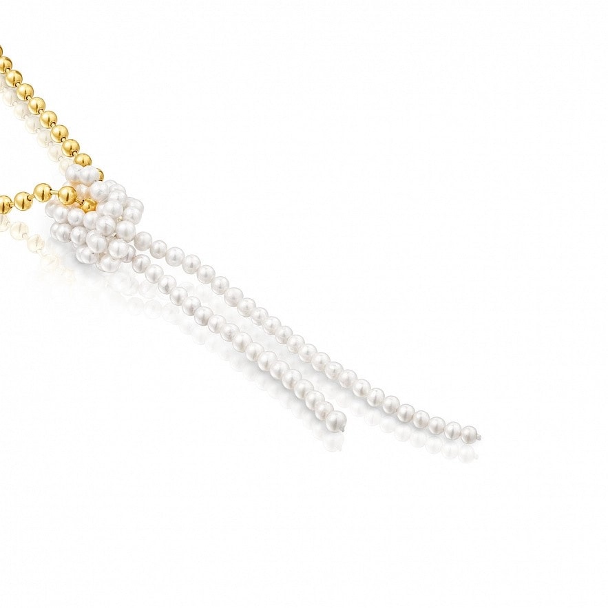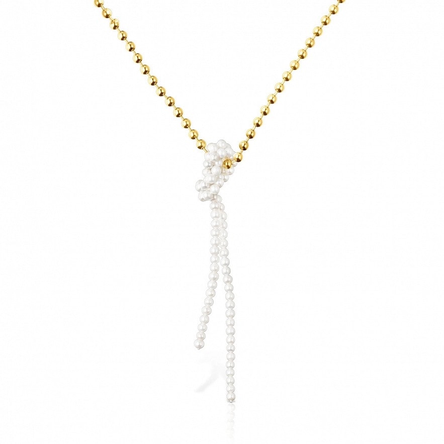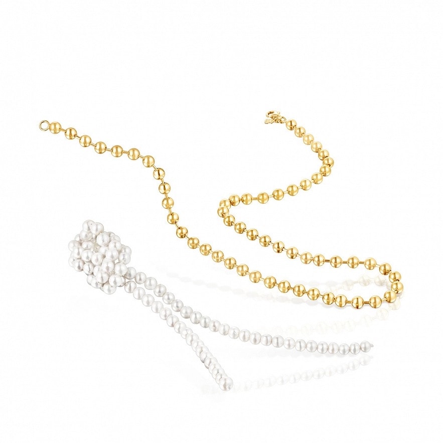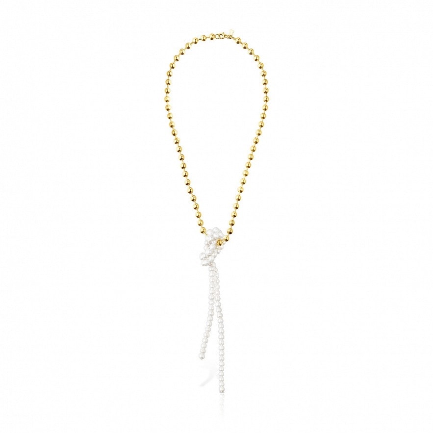 Намисто TOUS Gloss зі срібла 925 проби з покриттям Vermeil з ланцюжком з кульок і ланцюжком з культивованих перлин, зав'язаним по центру. Діаметр кульок: 5 мм. Діаметр культивованих перлин: 5 мм. Довжина кольє: 42 см. Довжина кулона: 14 см. Застібка-лобстер.