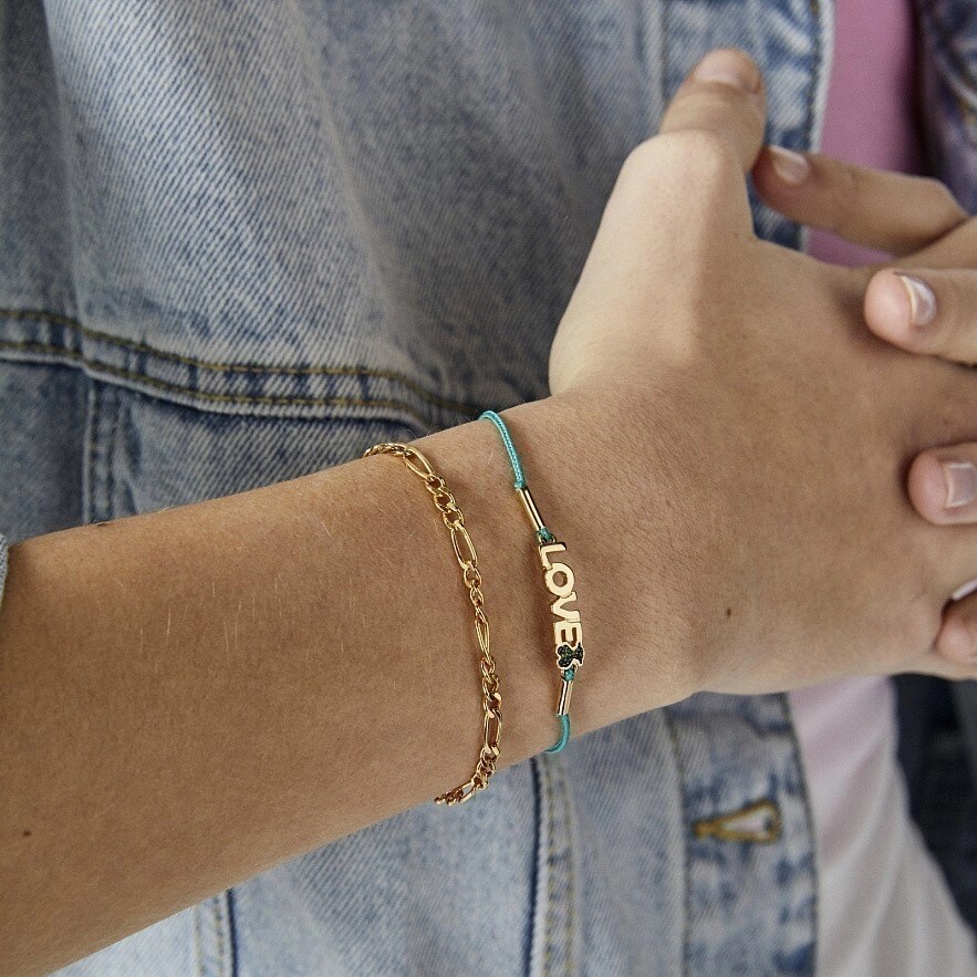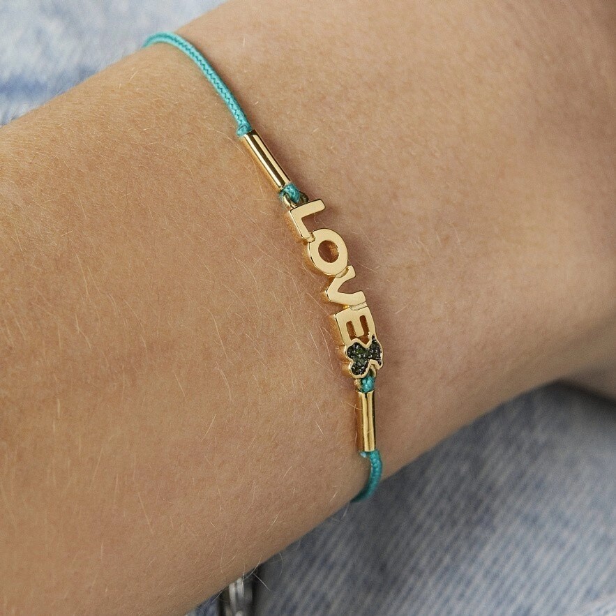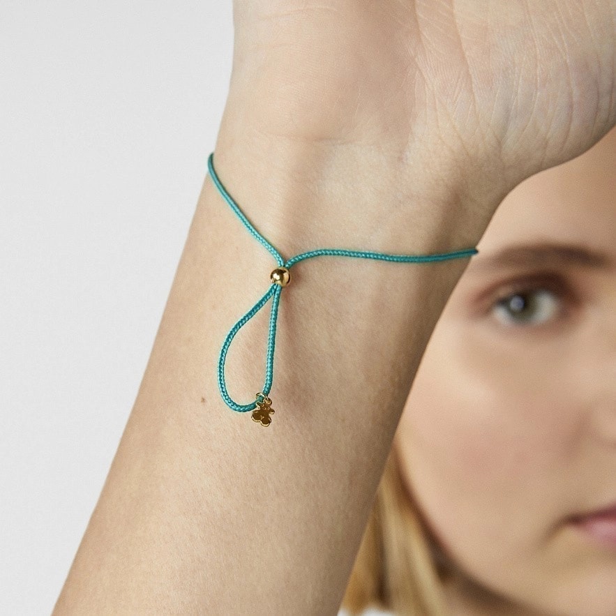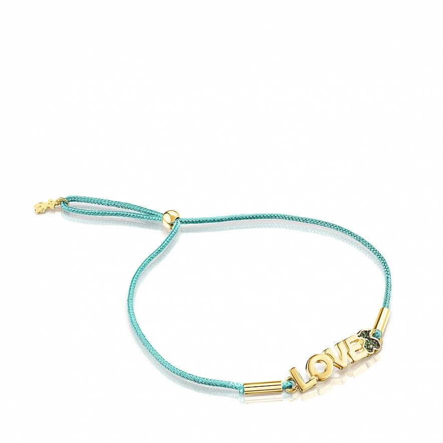 Браслет TOUS Crossword із срібла 925 проби з покриттям Vermeil зі словом LOVE та ведмедиком з хромовим діопсидом і зеленим шнуром. Vermeil : срібло з покриттям золота 18 карат.