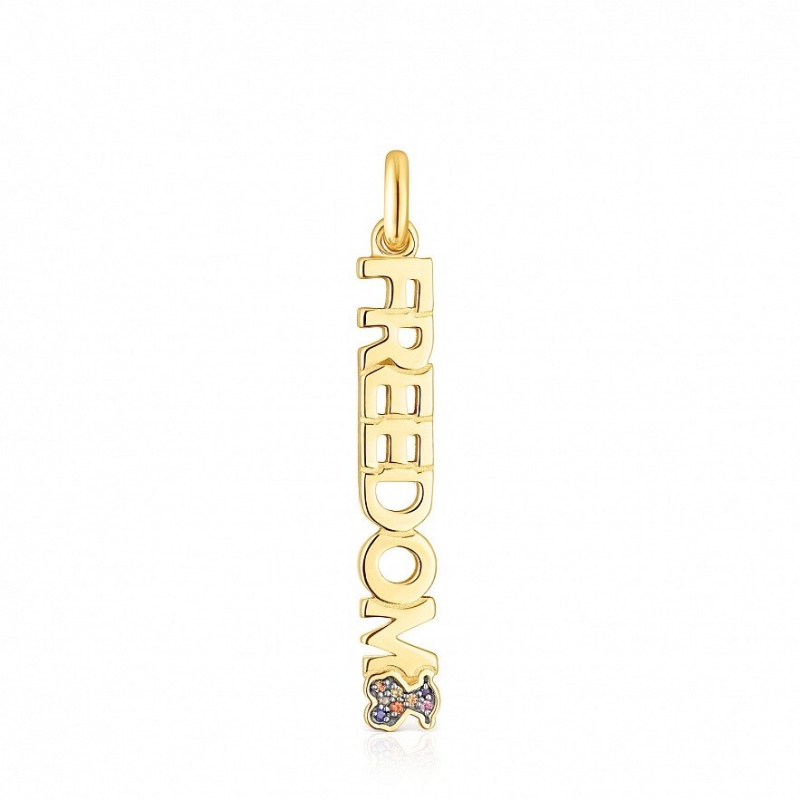 Кулон TOUS Crossword із срібла 925 проби з покриттям Vermeil зі словом FREEDOM та ведмедиком з сапфірів. Vermeil : срібло з покриттям золота 18 карат.