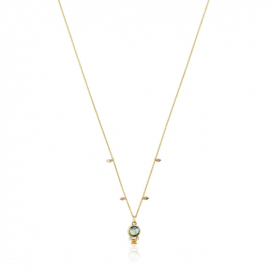 Намисто TOUS Virtual Garden із золота 750 проби з лабрадоритом 7 мм, помаранчевим сапфіром 3 мм і двома блакитними топазами 1,5 мм. Деталі з дорогоцінних каменів навколо ланцюжка: синій топаз, аметист, родоліт та діопсид хрому. Розмір деталей з дорогоцінних каменів: 1,5 мм. Застібка - пружинне кільце. Довжина кольє: 45 см.