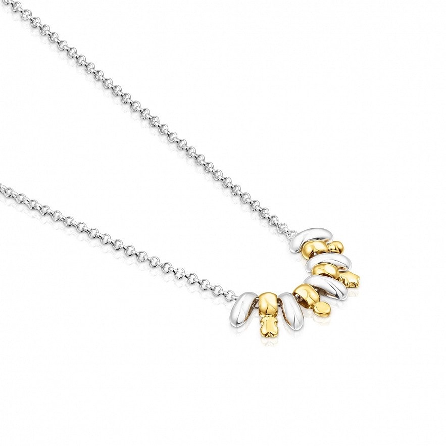 Намисто TOUS Virtual Garden зі стерлінгового срібла з підвісками, що чергуються в сріблі та сріблі з покриттям Vermeil . Підвіски у сріблі: 7,5 х 3 мм. Підвіски з покриттям Vermeil : кулька 4,5 х 3 мм, ведмедик 4,5 х 3,5 мм, серце 4,5 х 3 мм, зірка 4,5 х 3,3 мм. Довжина ланцюжка: 40/45 см. Vermeil : срібло з покриттям золота 18 карат.