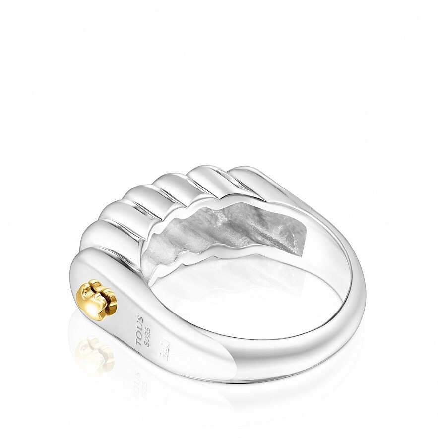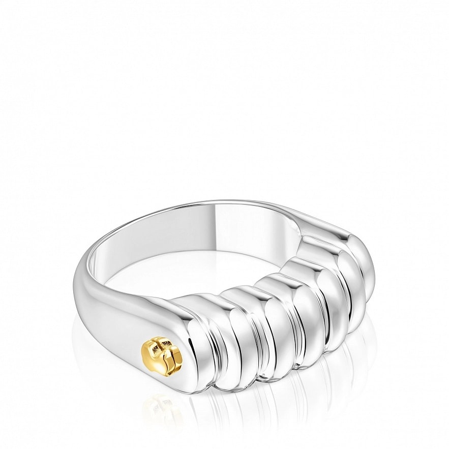 Каблучка-печатка TOUS Virtual Garden зі срібла 925 проби з імітацією структури гусениці на пруті. З боків - мотив ведмедика з покриттям Vermeil . Висота: 6 мм. Ширина бруска: 8 мм. Товщина: 4 мм. Vermeil : срібло з покриттям золота 18 карат.