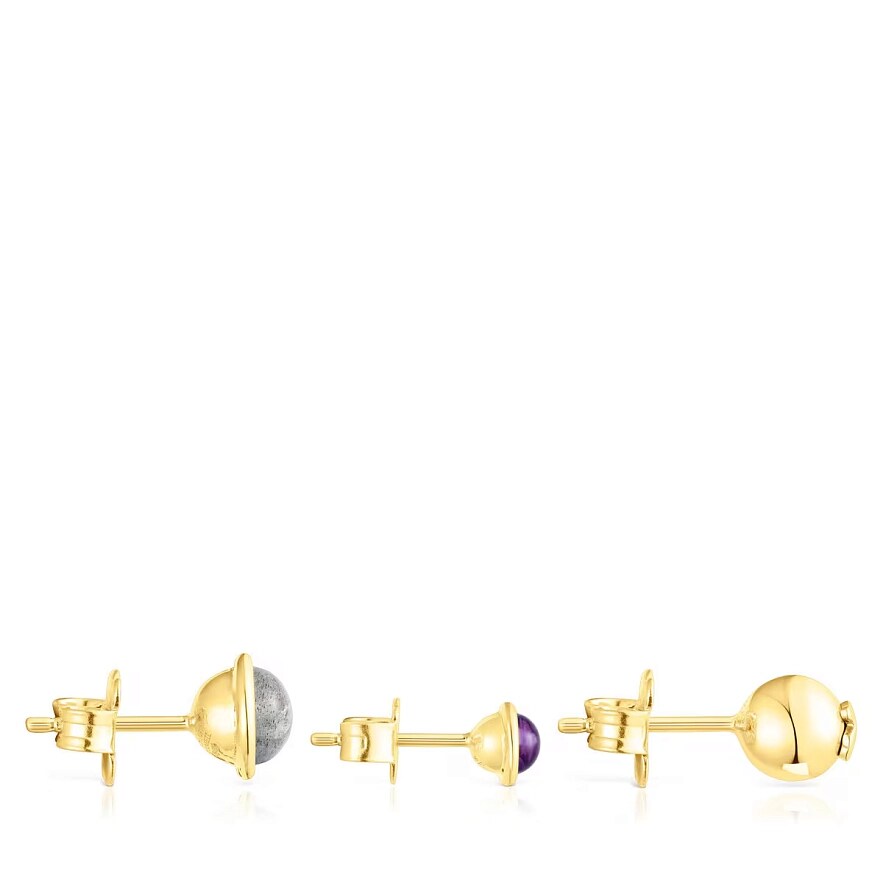 Комплект з трьох сережок TOUS Plump зі срібла 925 проби з покриттям Vermeil . Лабрадорит розміром 6-6,5 мм. Аметист розміром 4-4,5 мм. Кулька зі срібла 925 проби з покриттям Vermeil діаметром 6 мм з ведмедиком розміром 3 мм. Застібка-пусет. Vermeil : срібло з покриттям золота 18 карат.