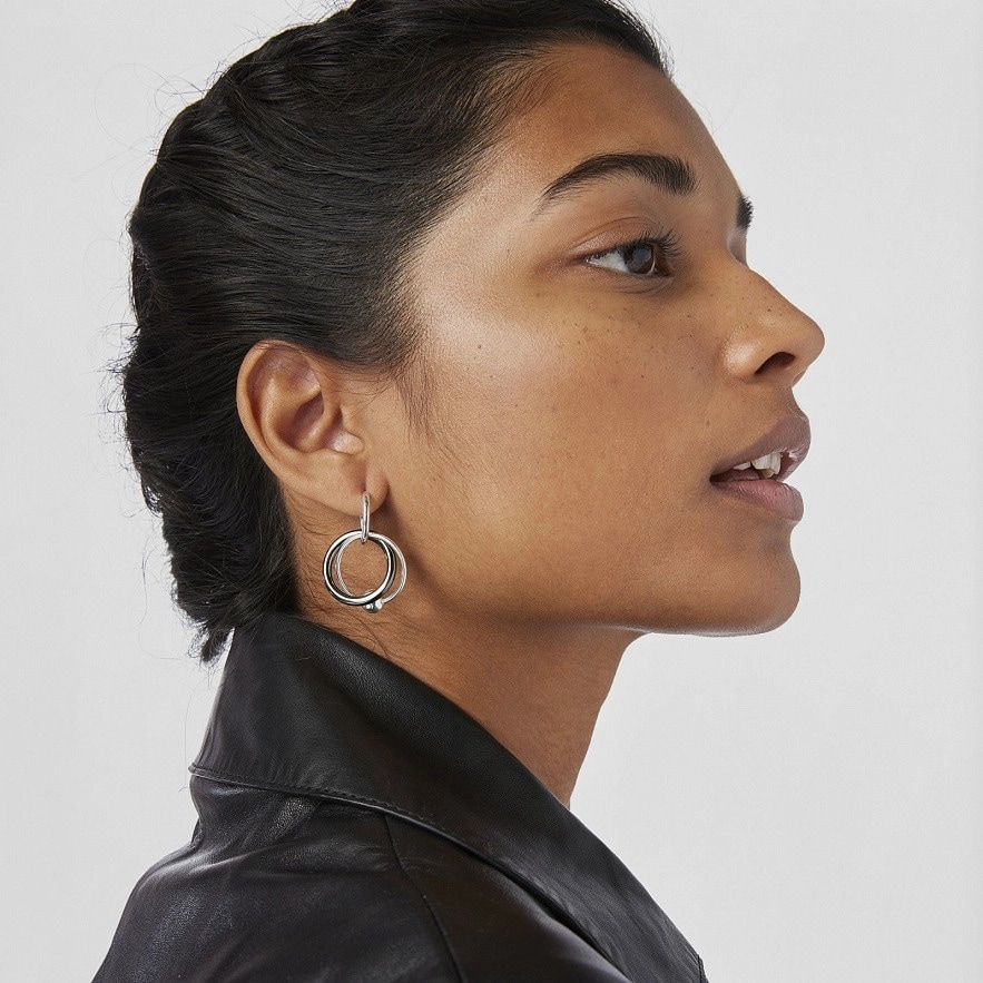Пухкі сережки TOUS зі срібла та темного срібла з двома переплетеними кільцями та деталлю кульки розміром 7 мм із вигравіруваним ведмедиком розміром 3 мм. Діаметр сережки: 16мм. Діаметр кілець: 18мм. Примітка: ці сережки можна носити коротко (вставивши обидва переплетені кільця в кільце сережки) або довго (вставивши лише одне з кілець).