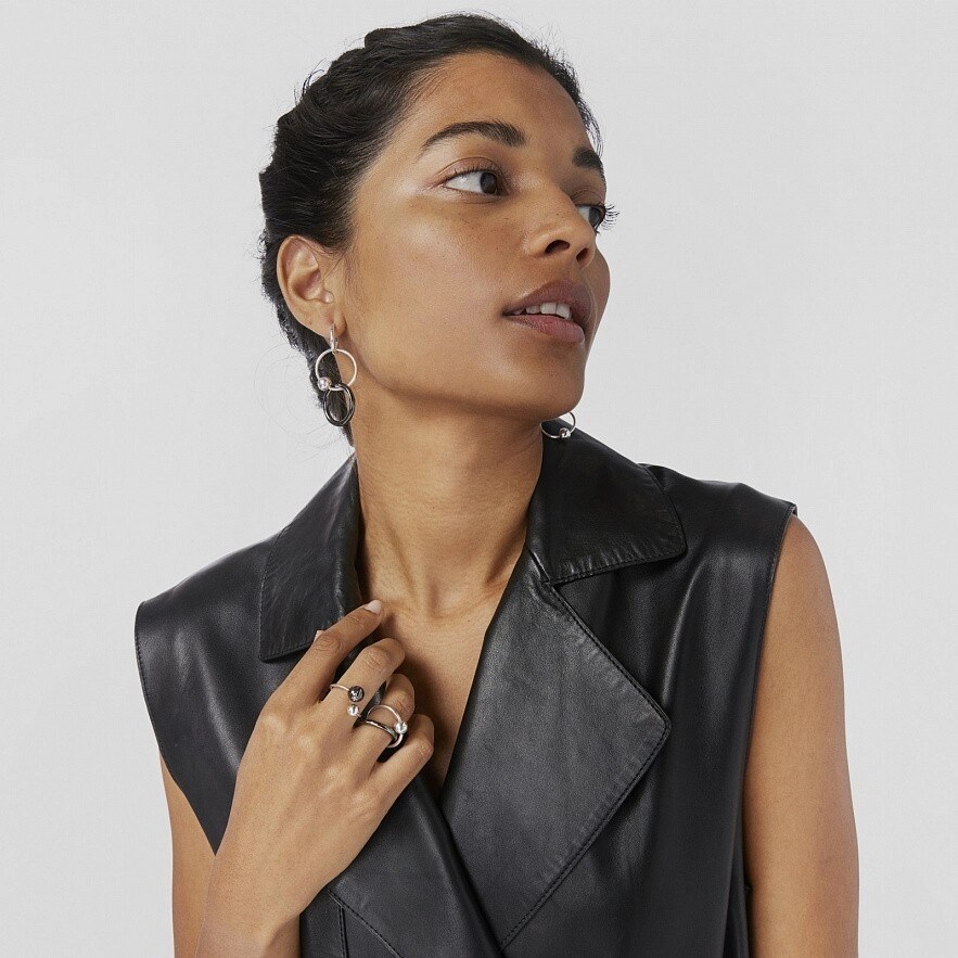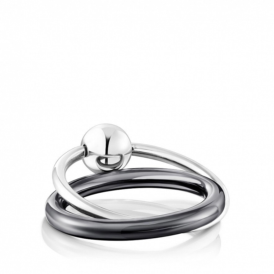Подвійна каблучка TOUS Plump із срібла та темного срібла з двома переплетеними кільцями та деталлю у вигляді кульки розміром 7мм з вигравіруваним ведмедем розміром 3мм. Товщина кілець: 1,8 та 3мм.