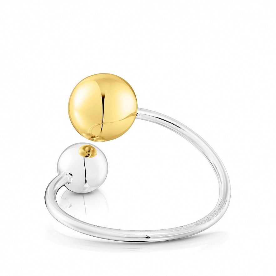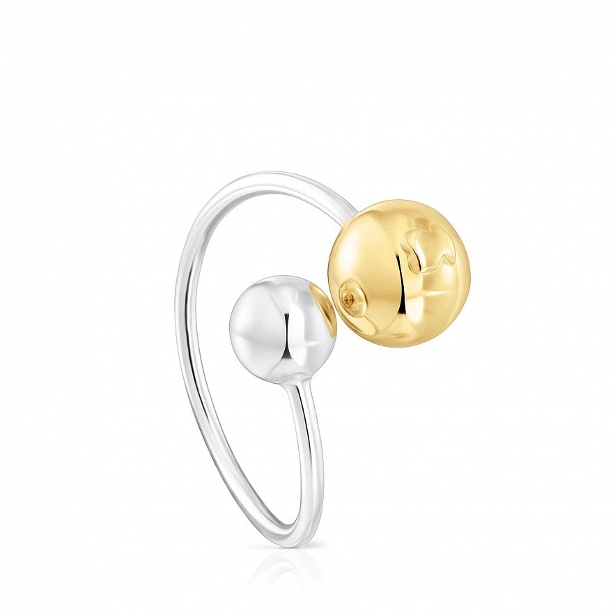 Пухка відкрита каблучка TOUS зі срібла та срібної вермелі з двома деталями у формі кулі та вигравіруваним ведмедиком розміром 3мм. Діаметр срібної вермеельної кульки: 8мм. Діаметр срібної кульки: 6мм. Товщина каблучки: 1,5мм.