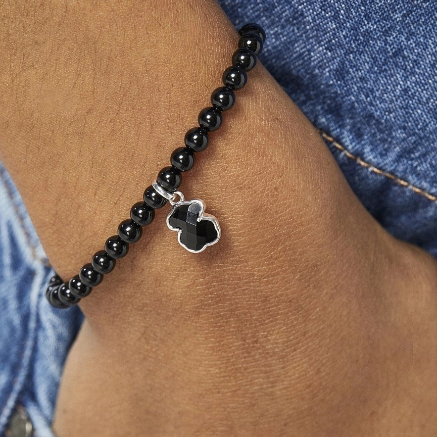Кольоровий браслет TOUS Icon із стерлінгового срібла з гладкими кульками з оніксу розміром ~4 мм і 9 мм підвіска з оніксовим ведмедиком.
